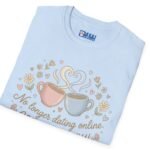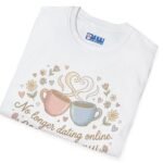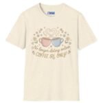 The shirt’s lightweight hand and classic crew cut keep the mood comfortable and unpretentious. Subtle earth tones in the print pair well with denim, layered jackets, or a scarf, making it simple to style for weekend coffee runs or laid-back social events. It’s for people who prefer cheeks warmed by a mug and real laughter over screens — a gentle wardrobe piece that sparks smiles and starts conversations.