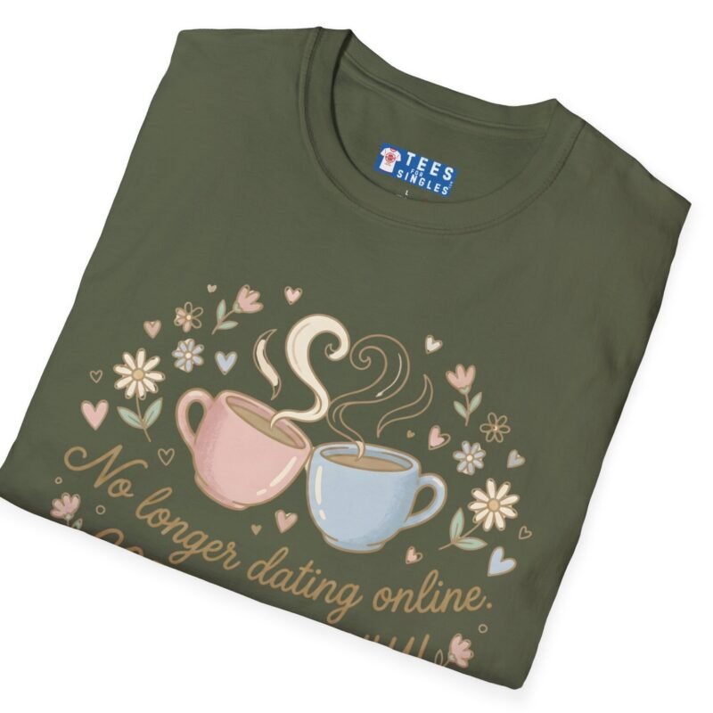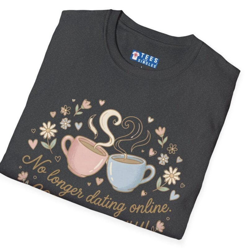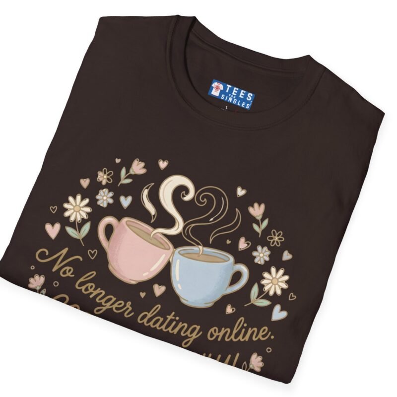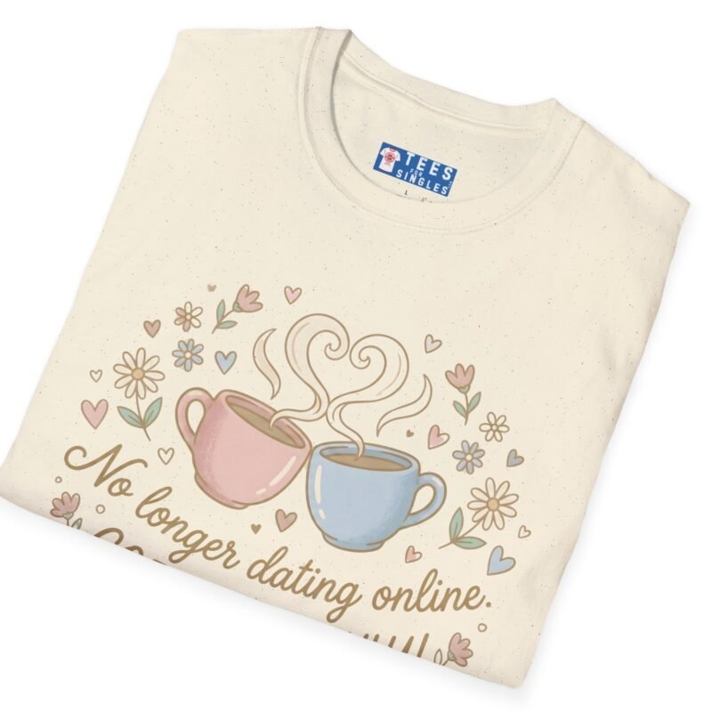 The soft pastel coffee cups, floral details, and heart shaped steam create a warm, approachable vibe. Then the message lands. No longer dating online. Coffee IRL only. It feels honest, playful, and refreshingly direct without being aggressive.