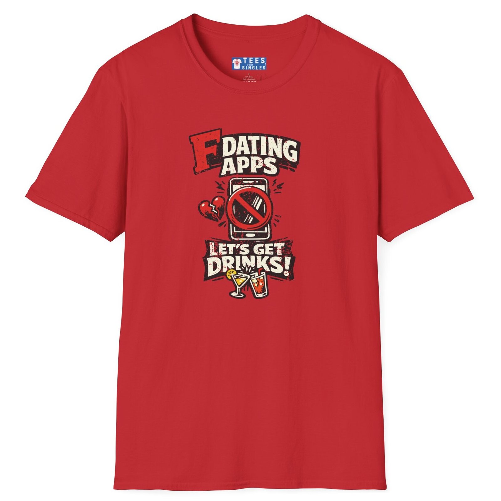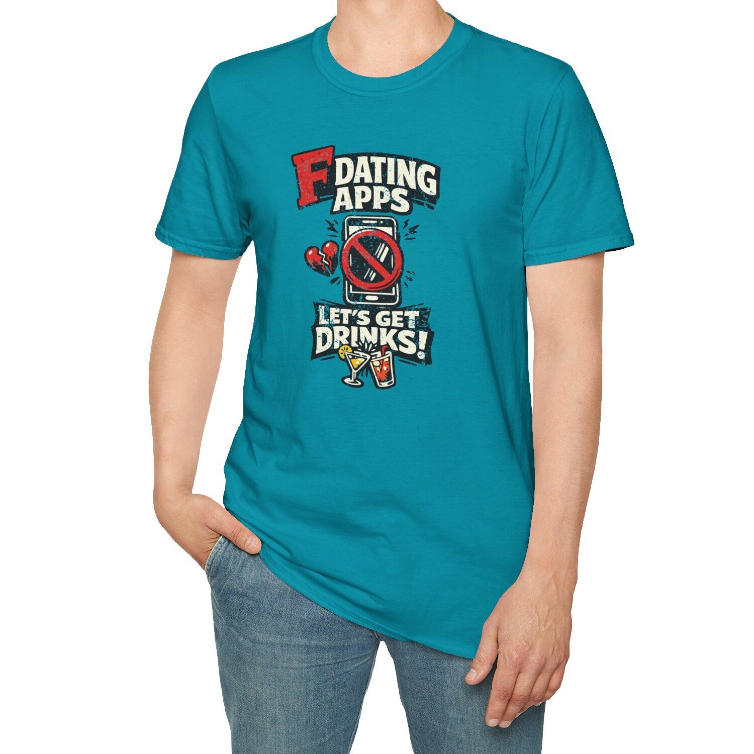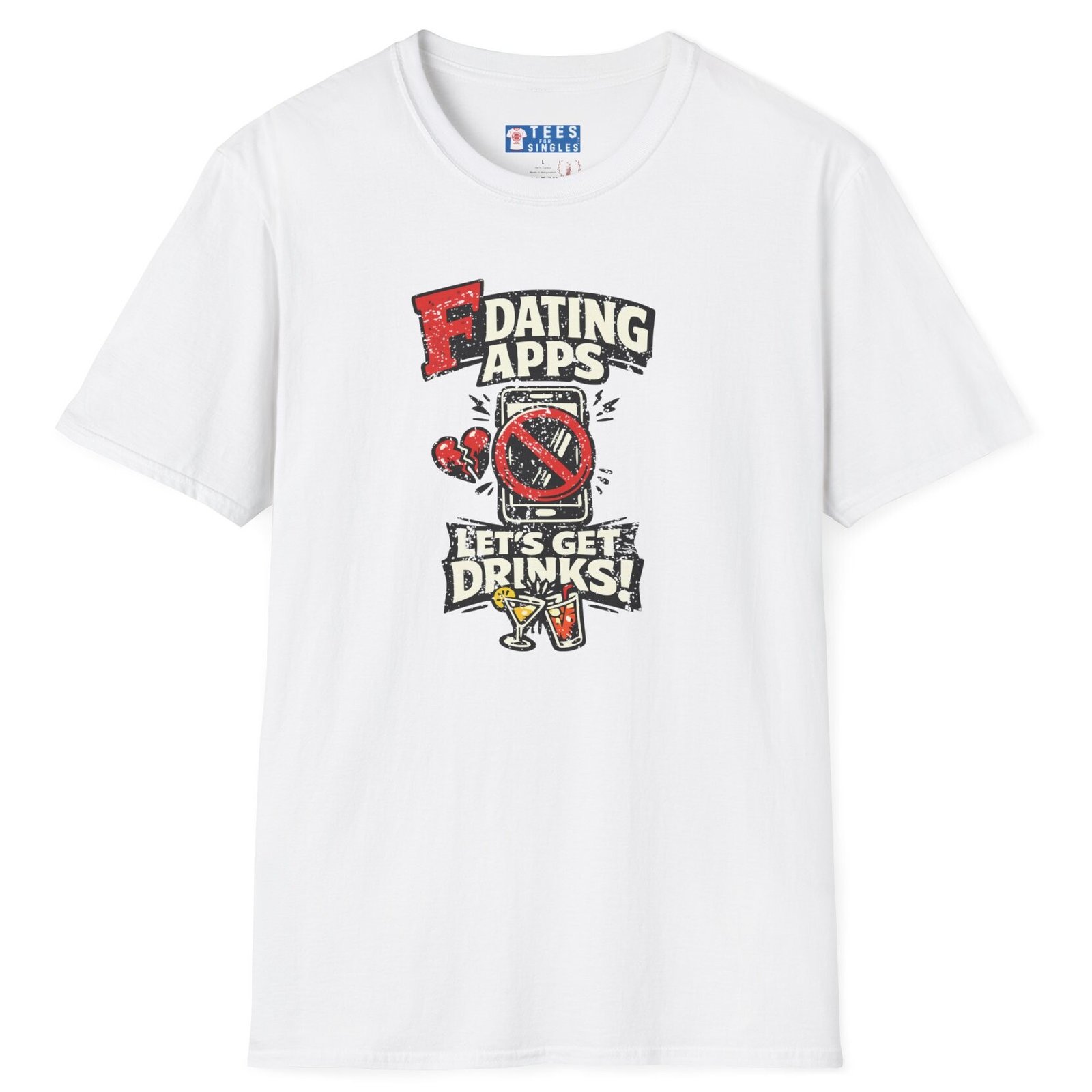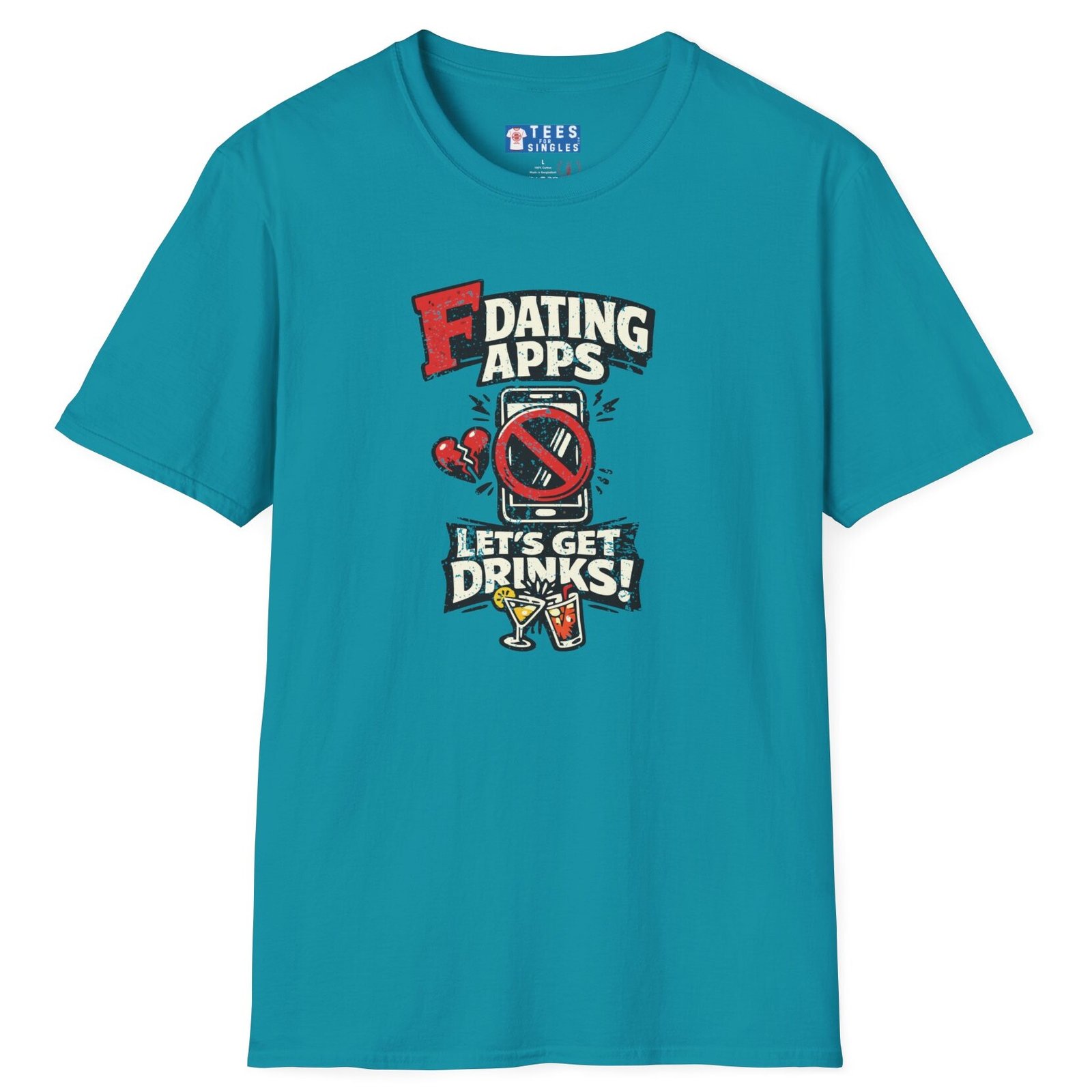 Big bold text calls out dating apps, a crossed out phone makes the point clear, and the punchline lands hard with Let’s Get Drinks. It is direct, funny, and refreshingly honest without trying too hard.