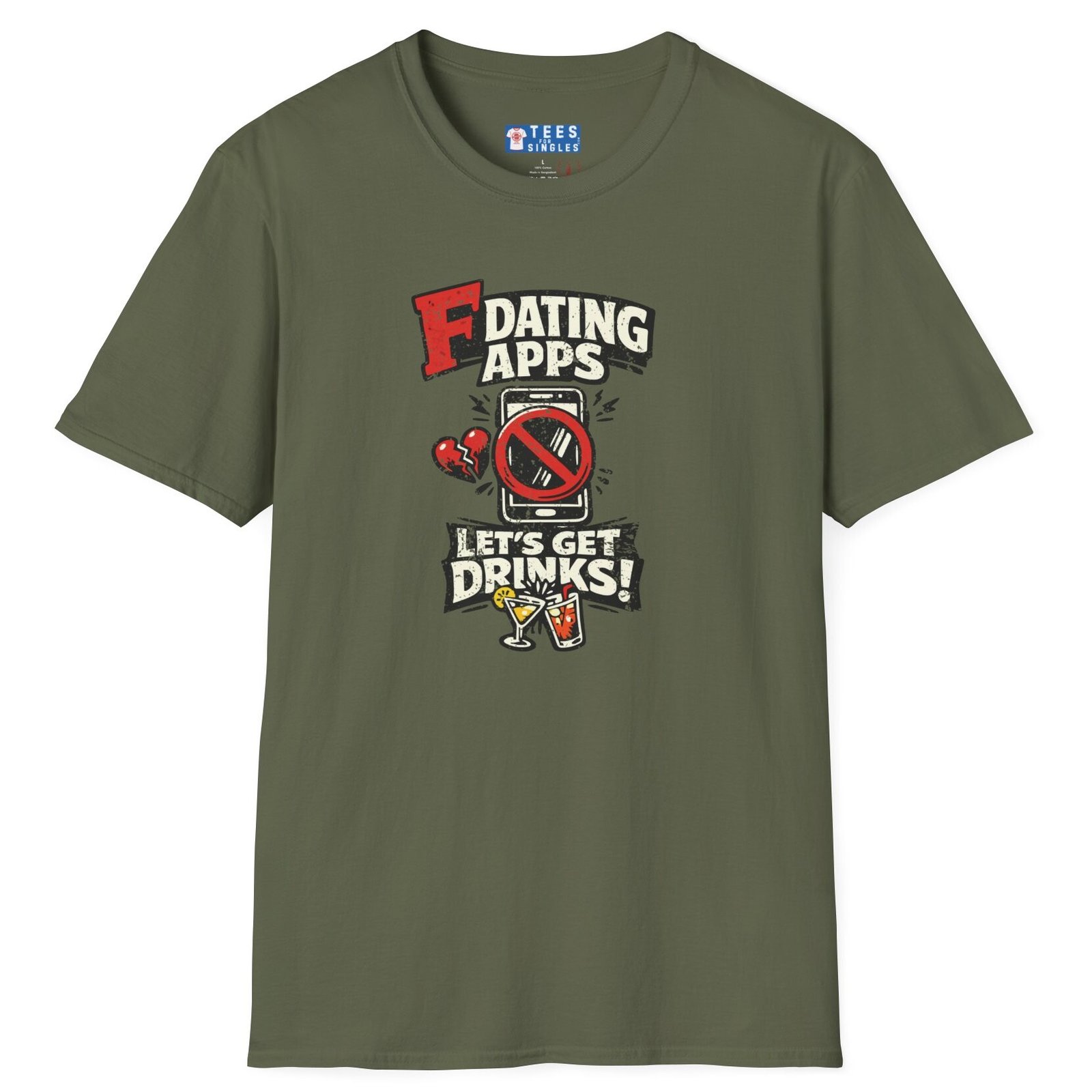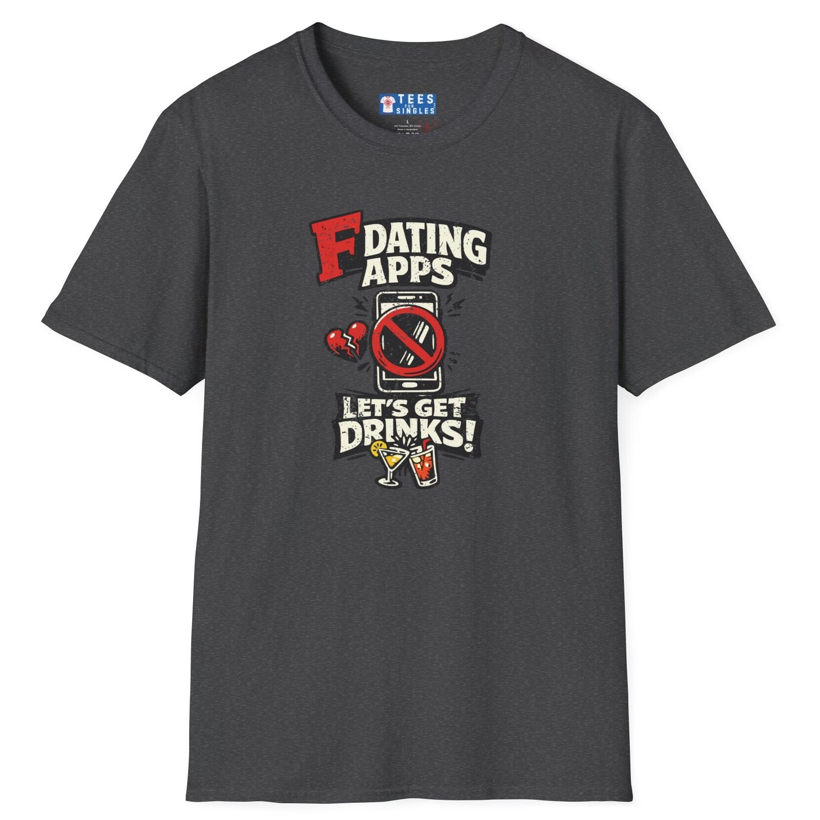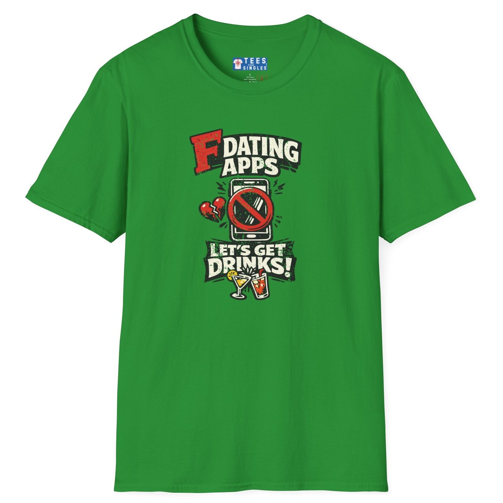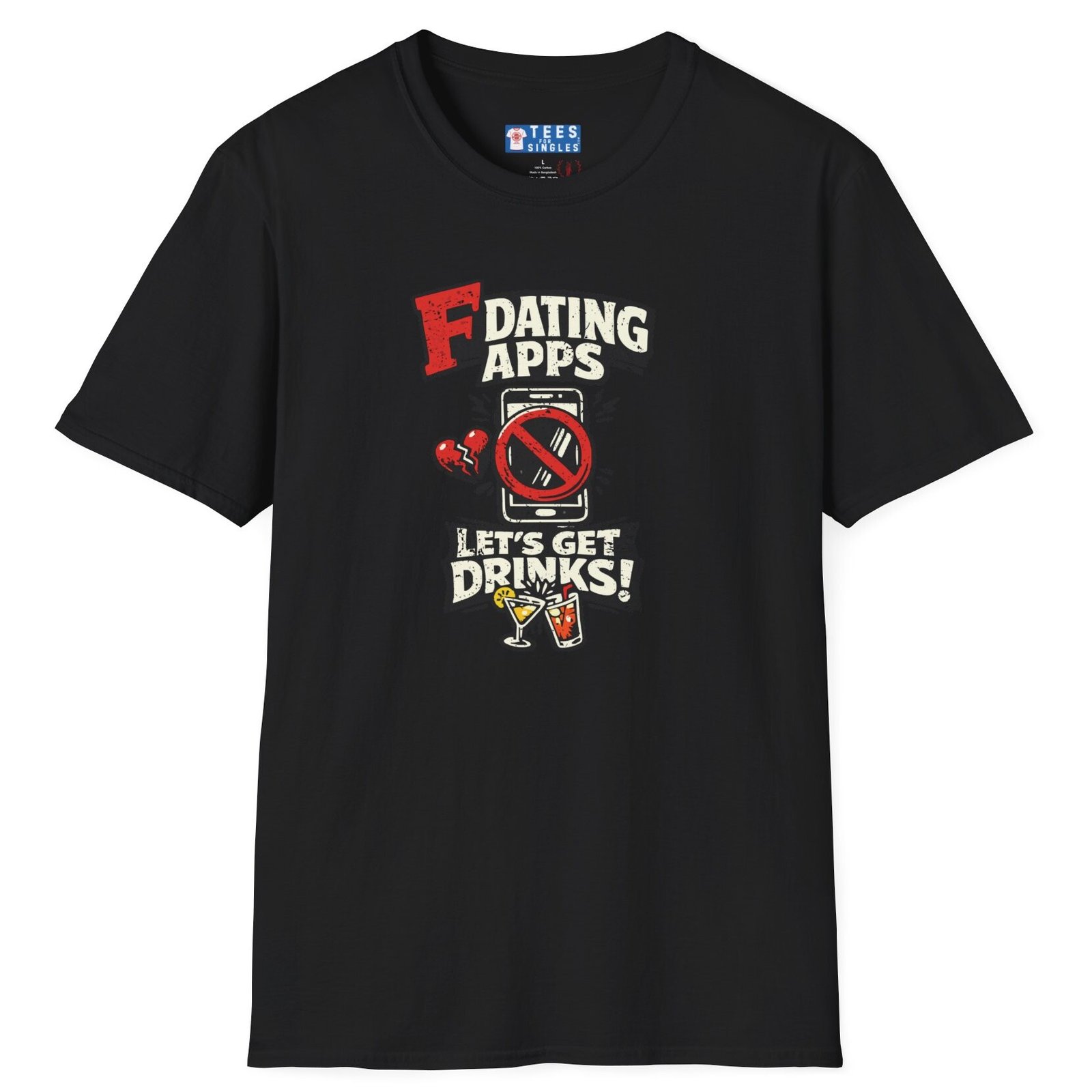 Big bold text calls out dating apps, a crossed out phone makes the point clear, and the punchline lands hard with Let’s Get Drinks. It is direct, funny, and refreshingly honest without trying too hard.