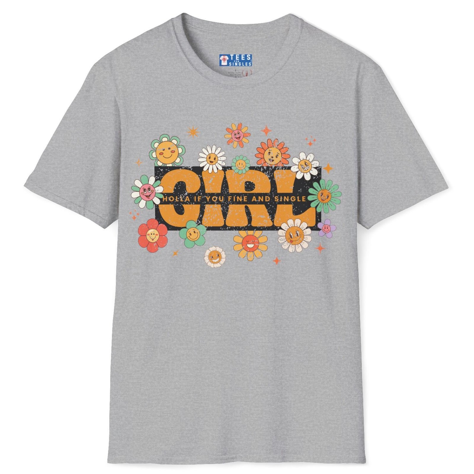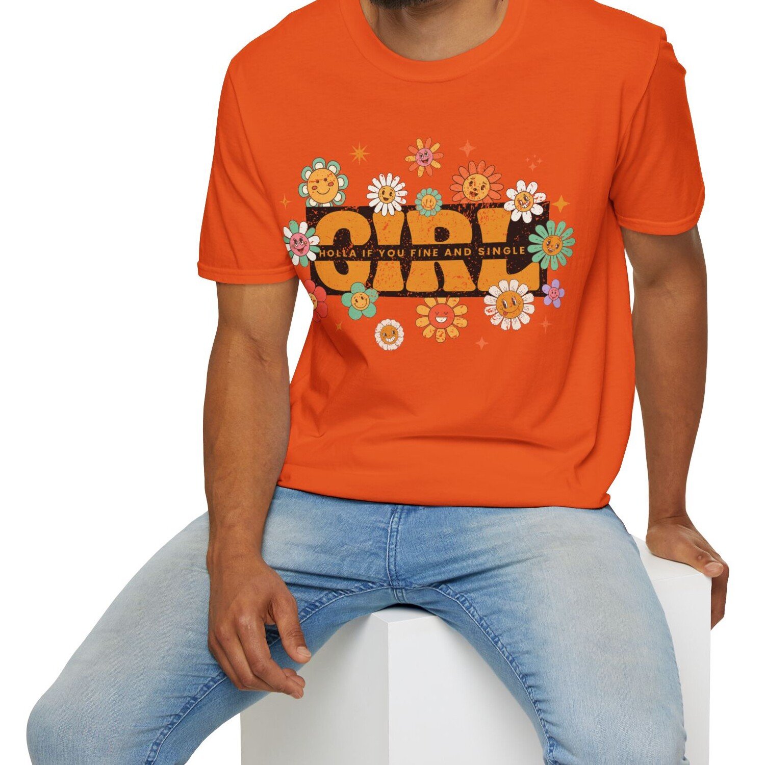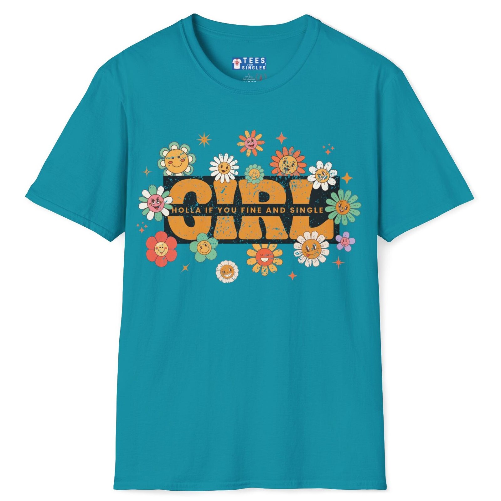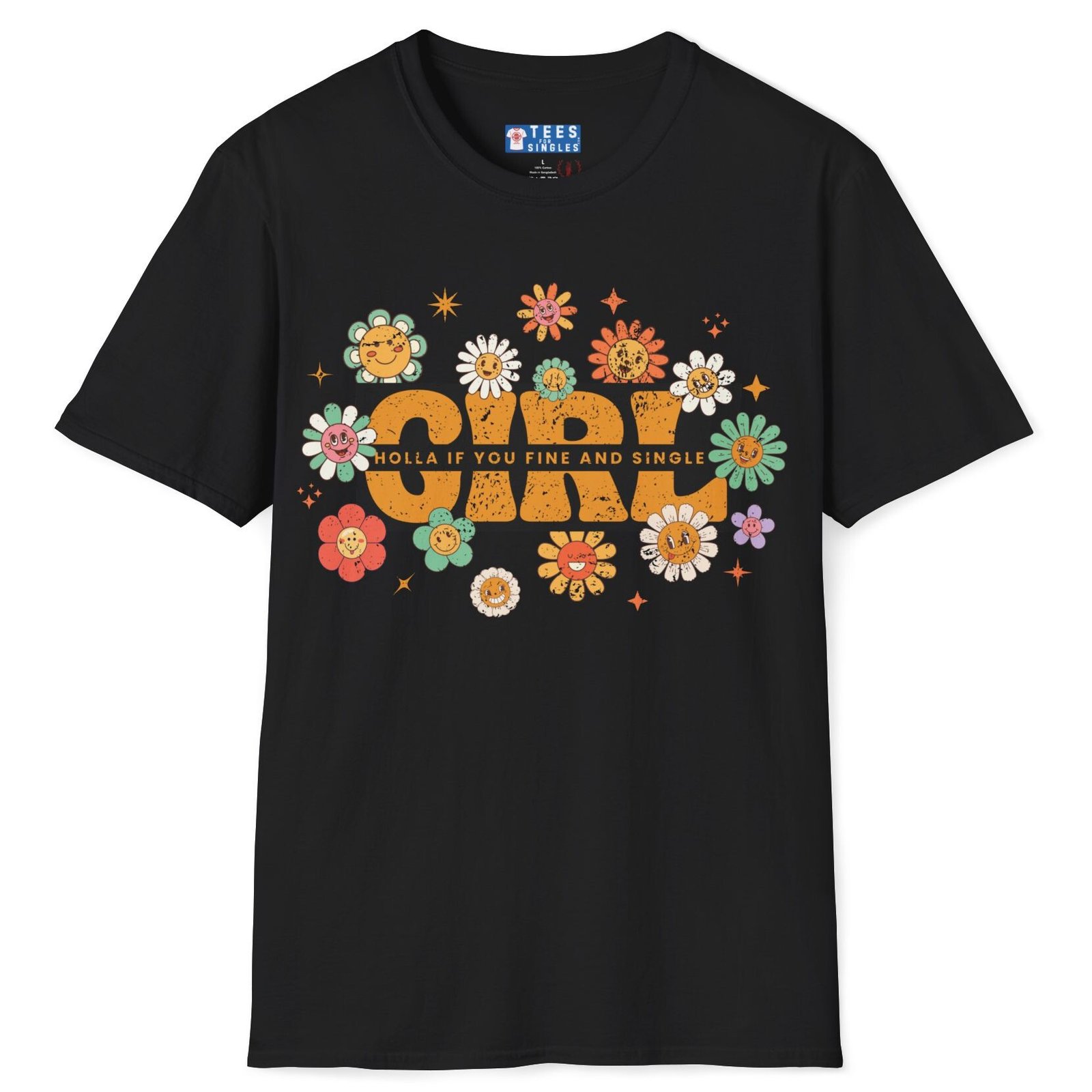 The Girl – Holla If You Fine & Single tee is pure fun with a retro twist. Bright, smiling flowers meet bold text to make your relationship status (and standards) crystal clear—while keeping it flirty and lighthearted. Perfect for festivals, coffee runs, or anywhere you want to spark conversations with the right kind of people.