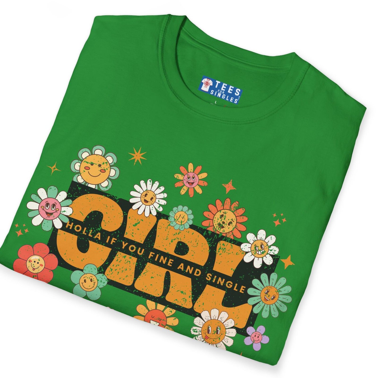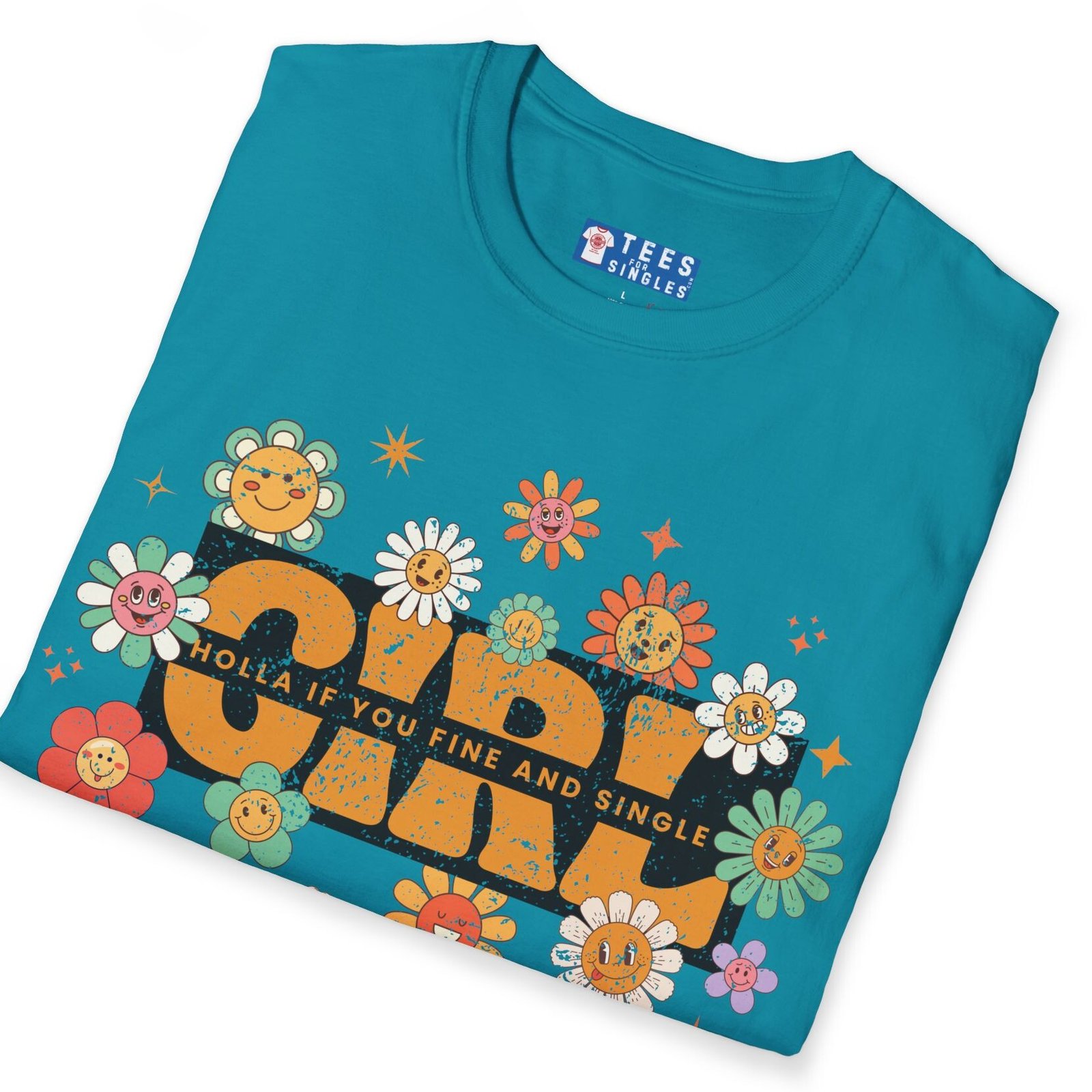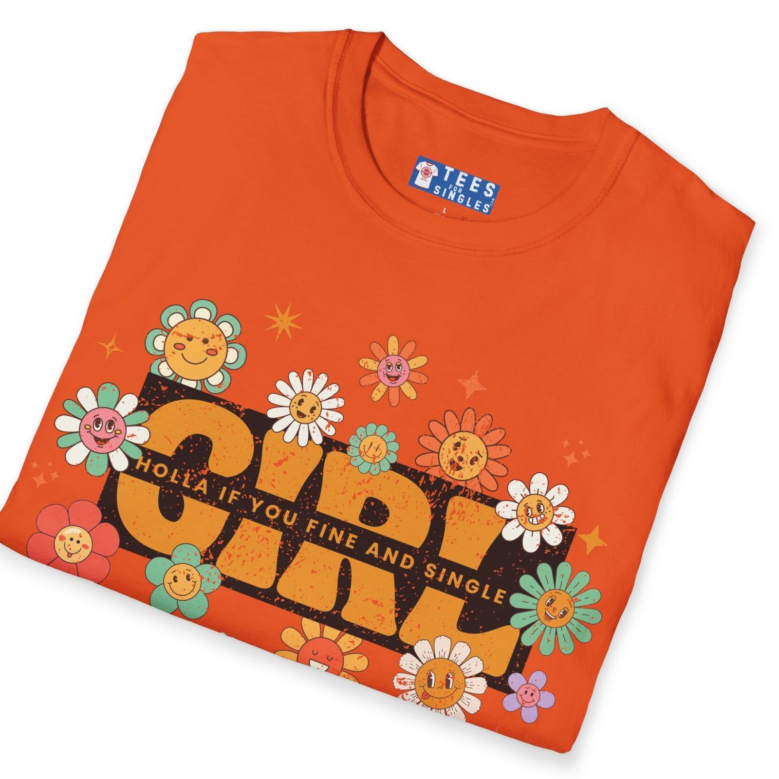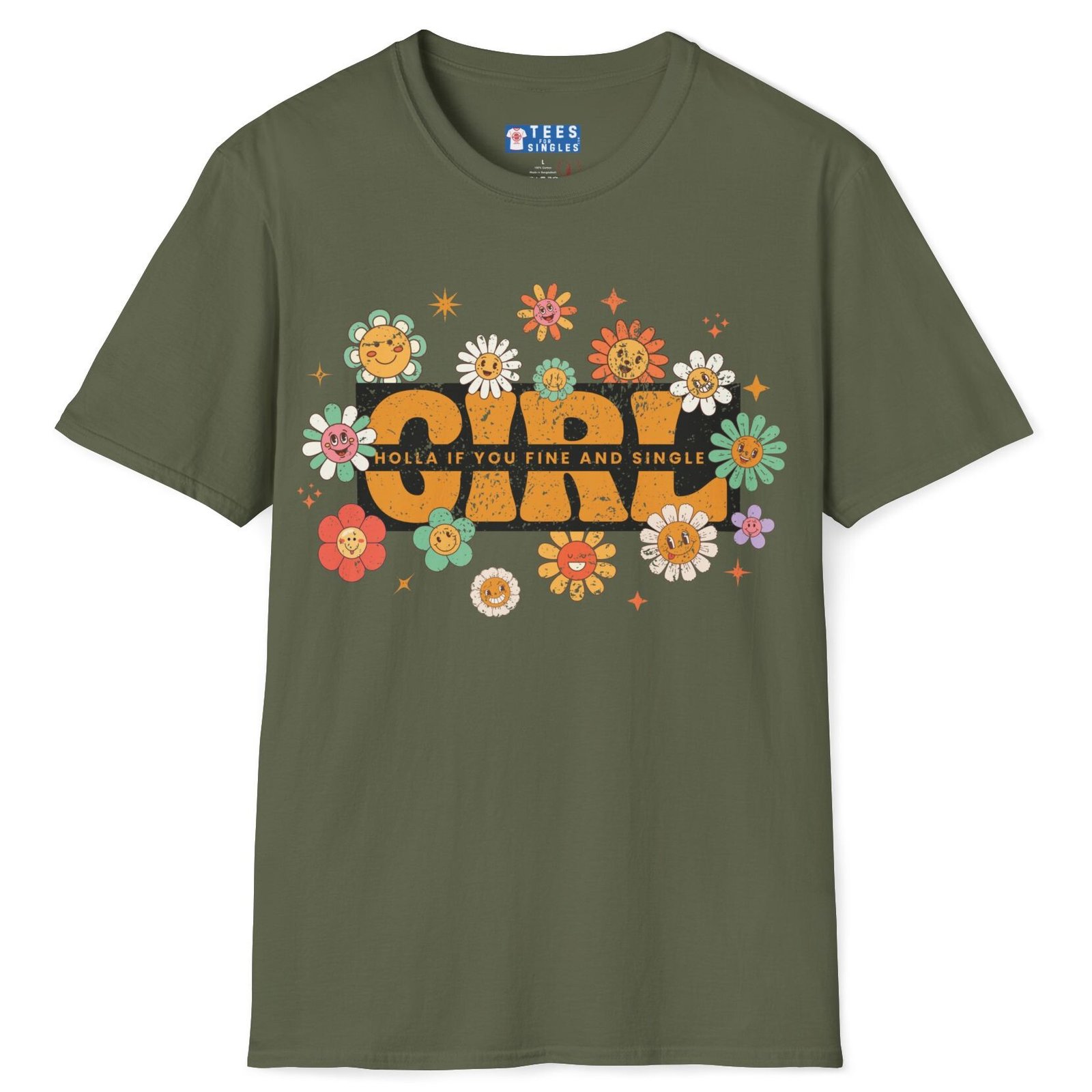 The Girl – Holla If You Fine & Single tee is pure fun with a retro twist. Bright, smiling flowers meet bold text to make your relationship status (and standards) crystal clear—while keeping it flirty and lighthearted. Perfect for festivals, coffee runs, or anywhere you want to spark conversations with the right kind of people.