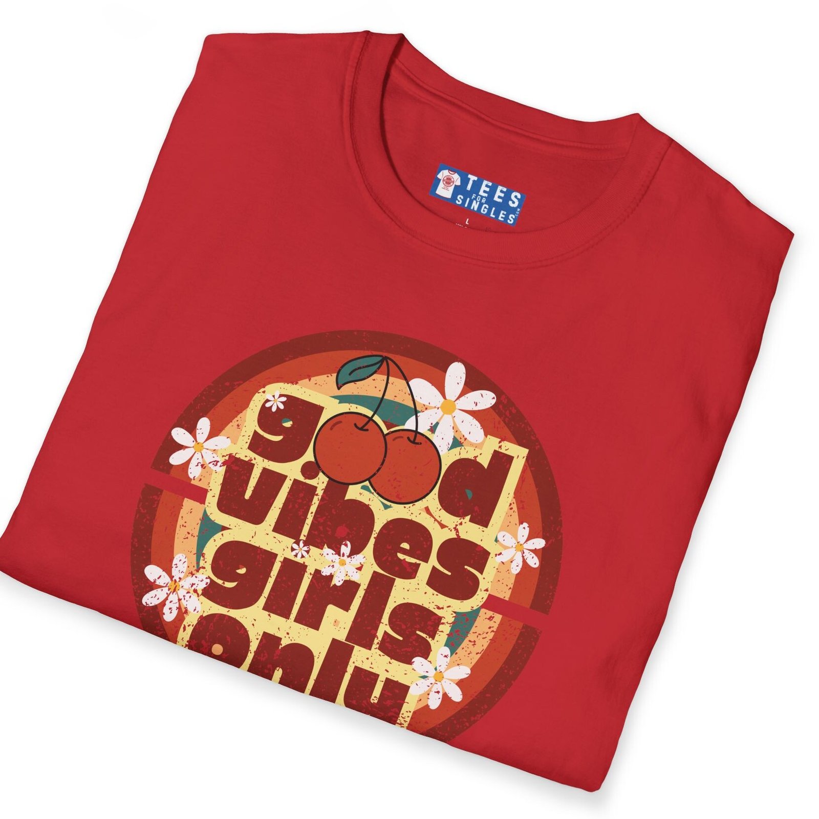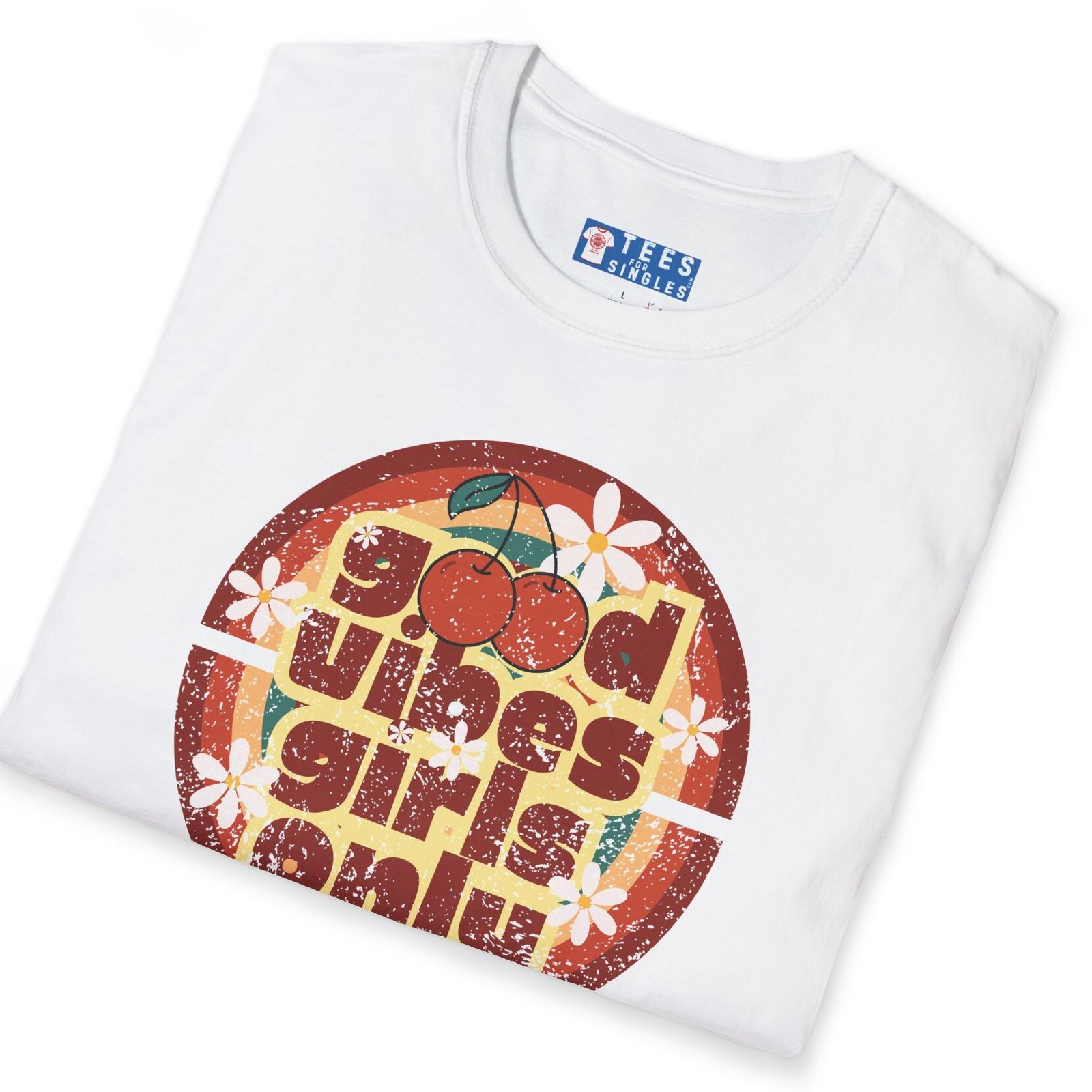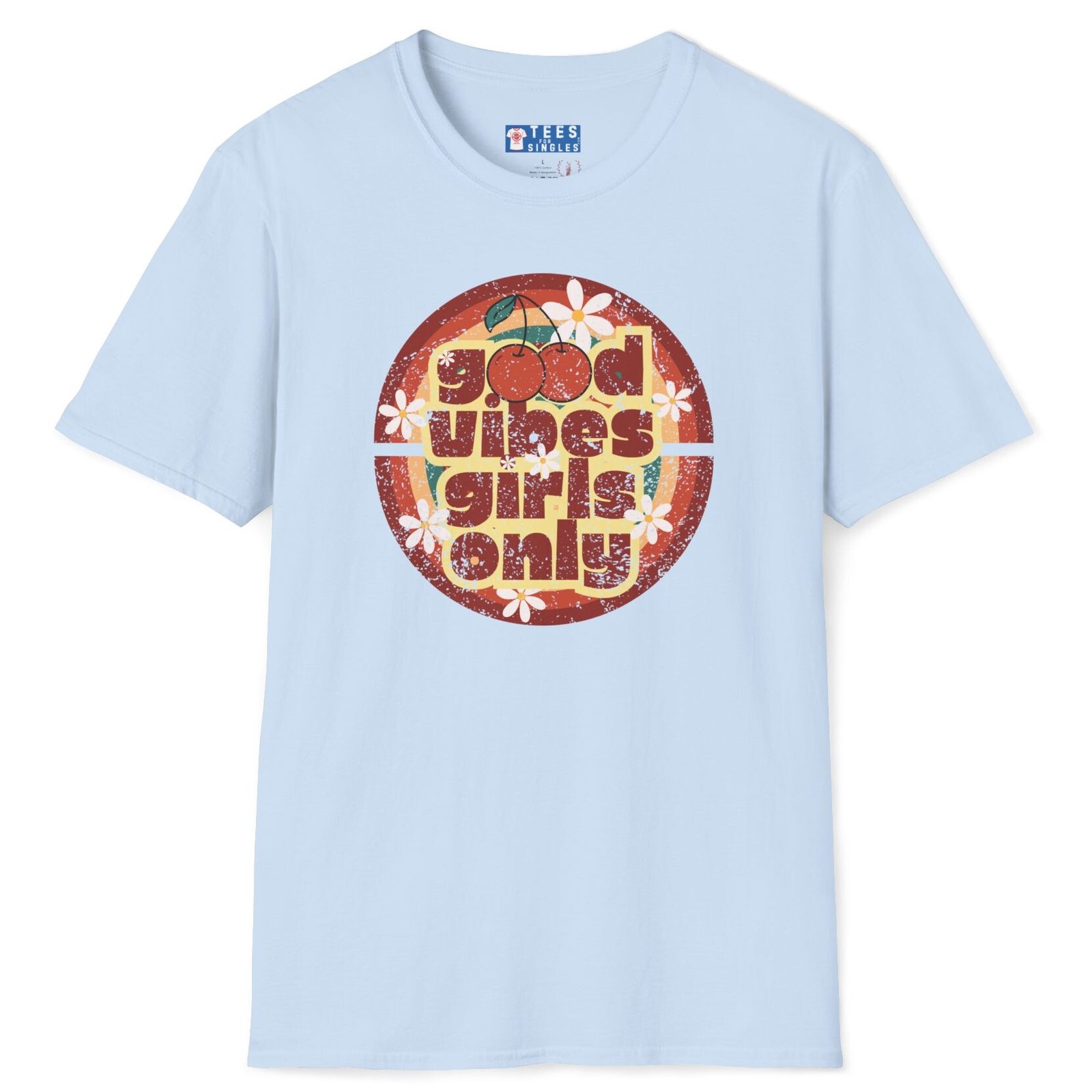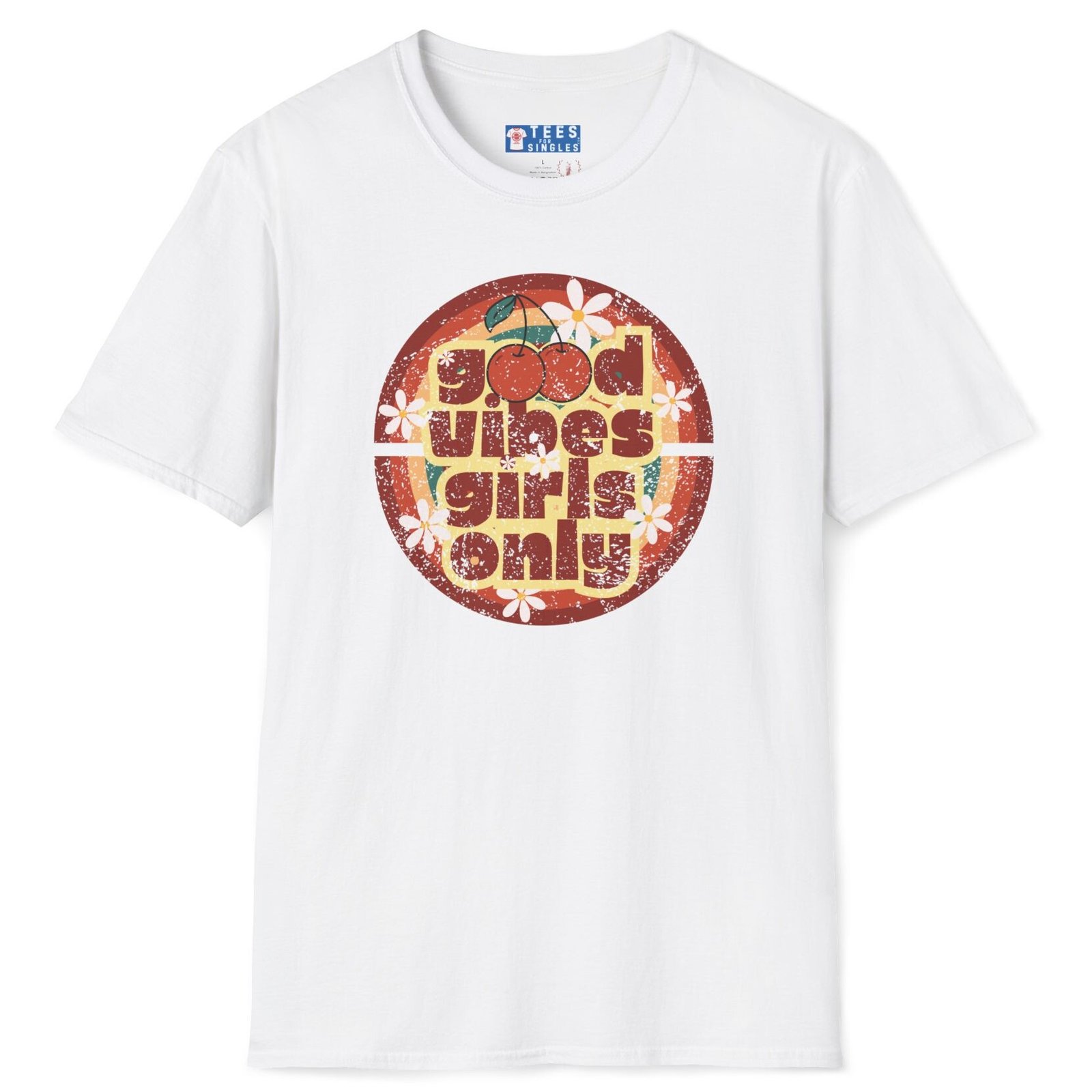 Keywords/Tags: good vibes shirt, girls only retro tee, cherry graphic t-shirt, vintage summer shirt, 70s festival outfit, flirty conversation starter tee, retro aesthetic shirt, Gildan 64000 premium, singles graphic tee, funny cute attract women shirt