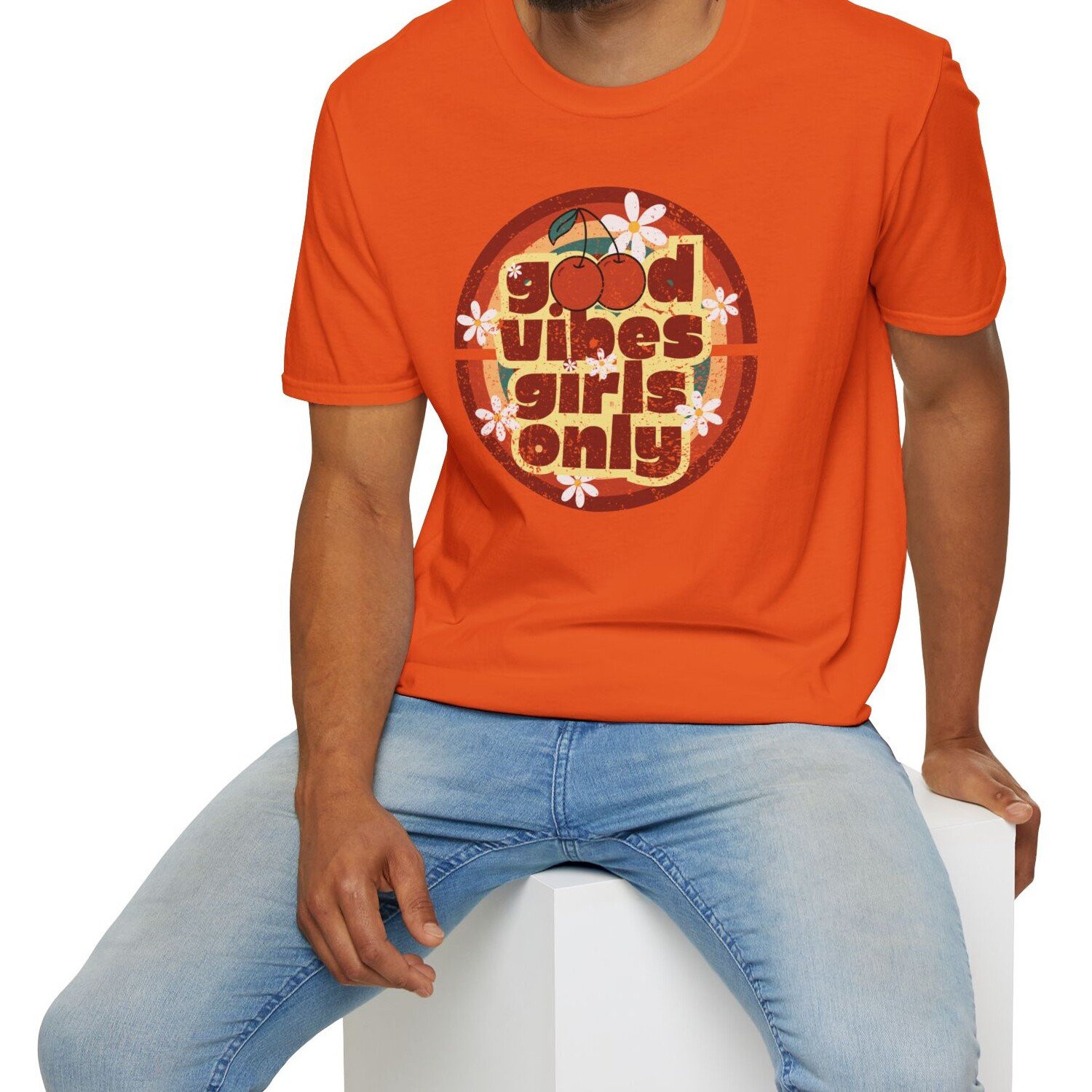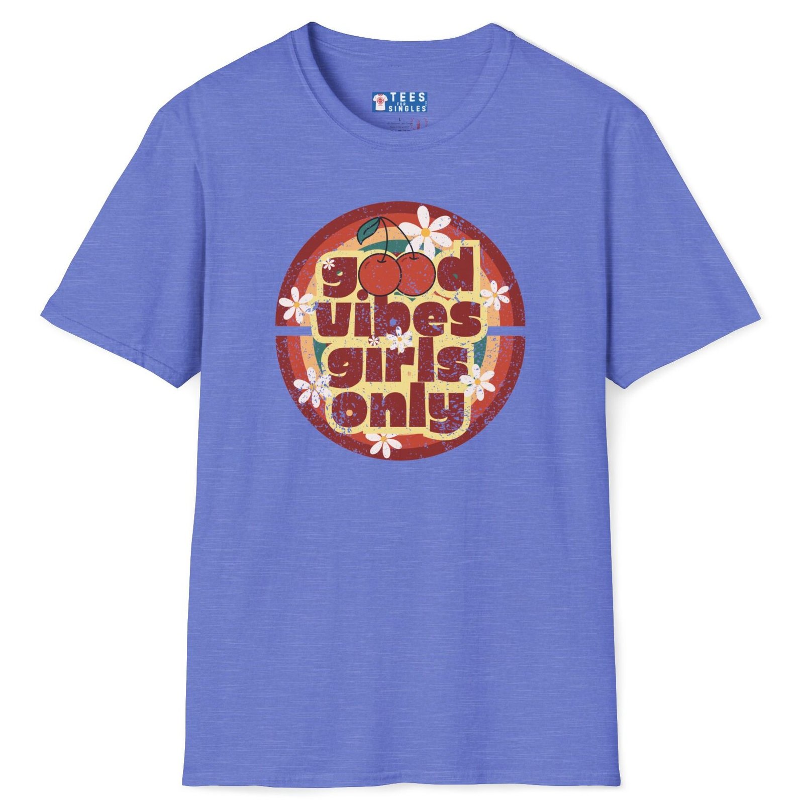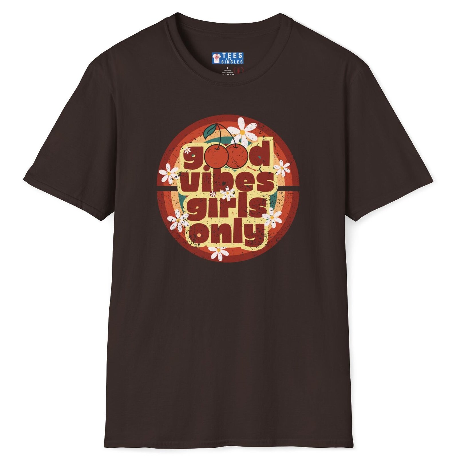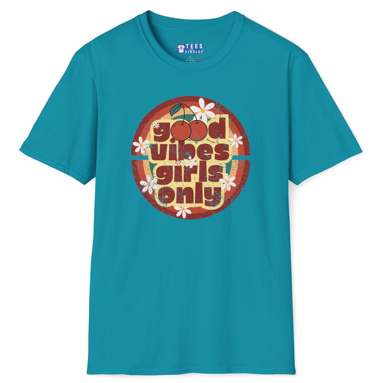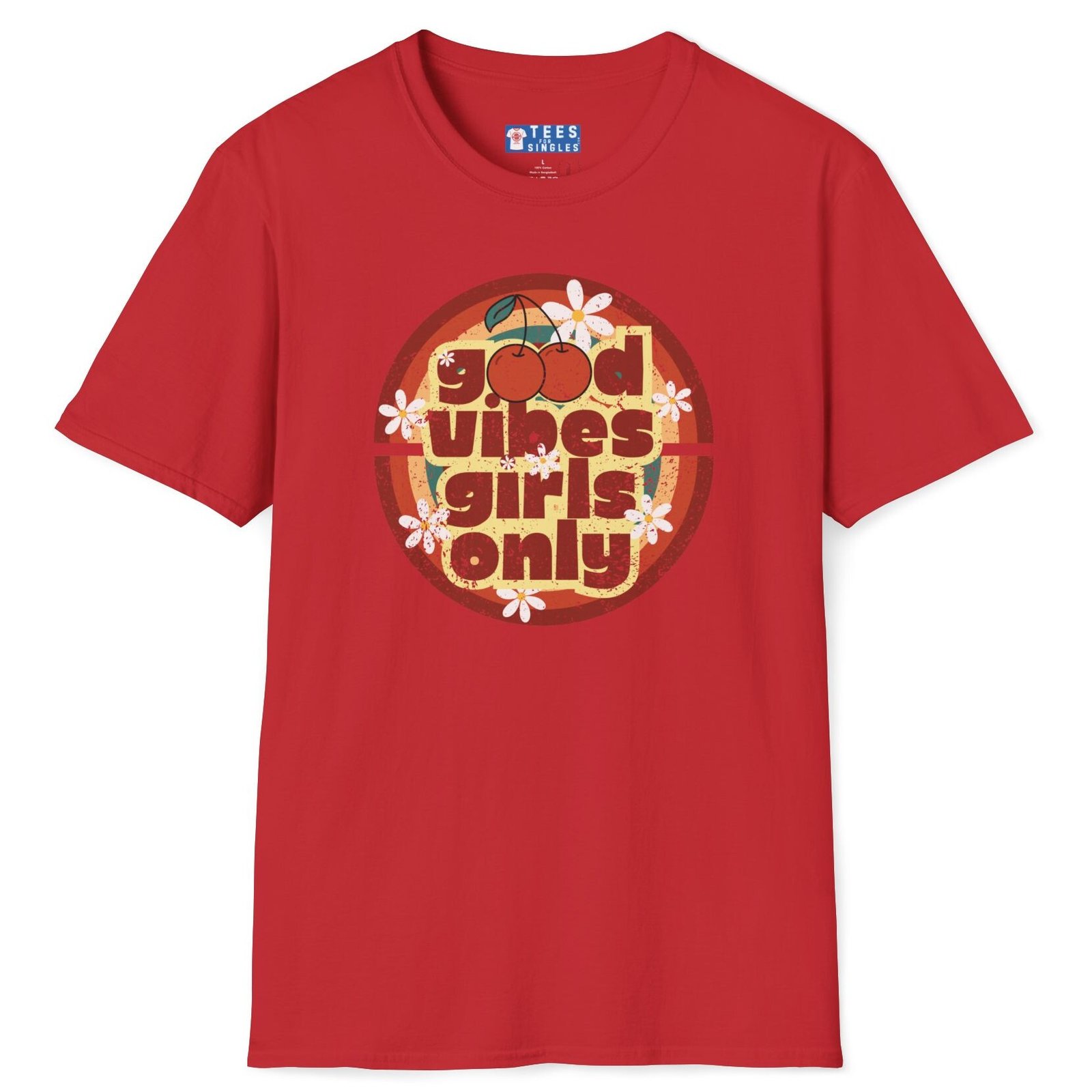 Keywords/Tags: good vibes shirt, girls only retro tee, cherry graphic t-shirt, vintage summer shirt, 70s festival outfit, flirty conversation starter tee, retro aesthetic shirt, Gildan 64000 premium, singles graphic tee, funny cute attract women shirt