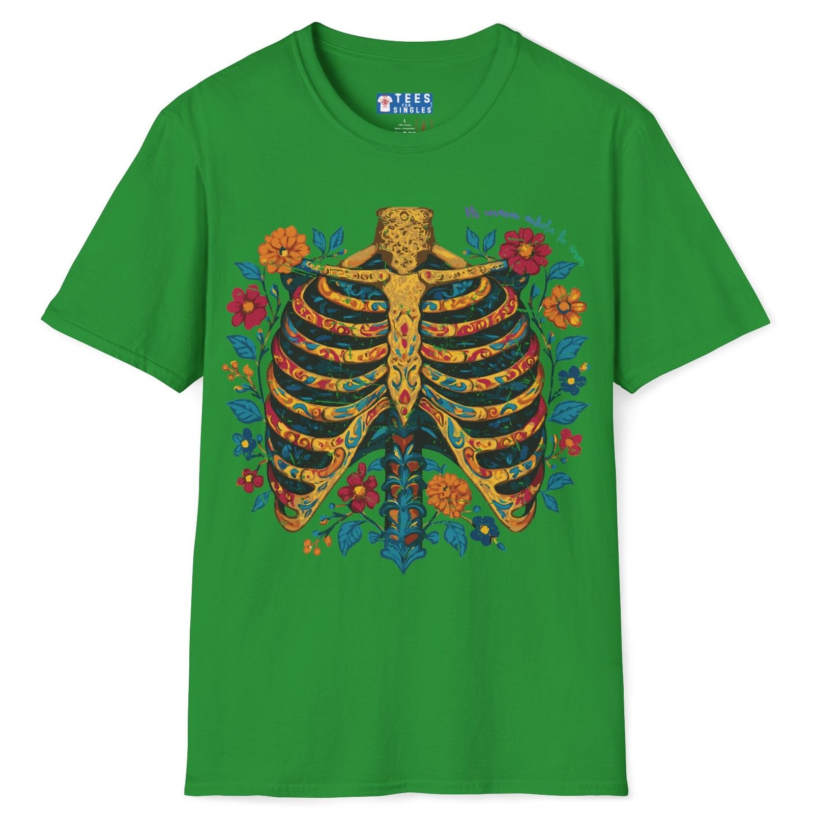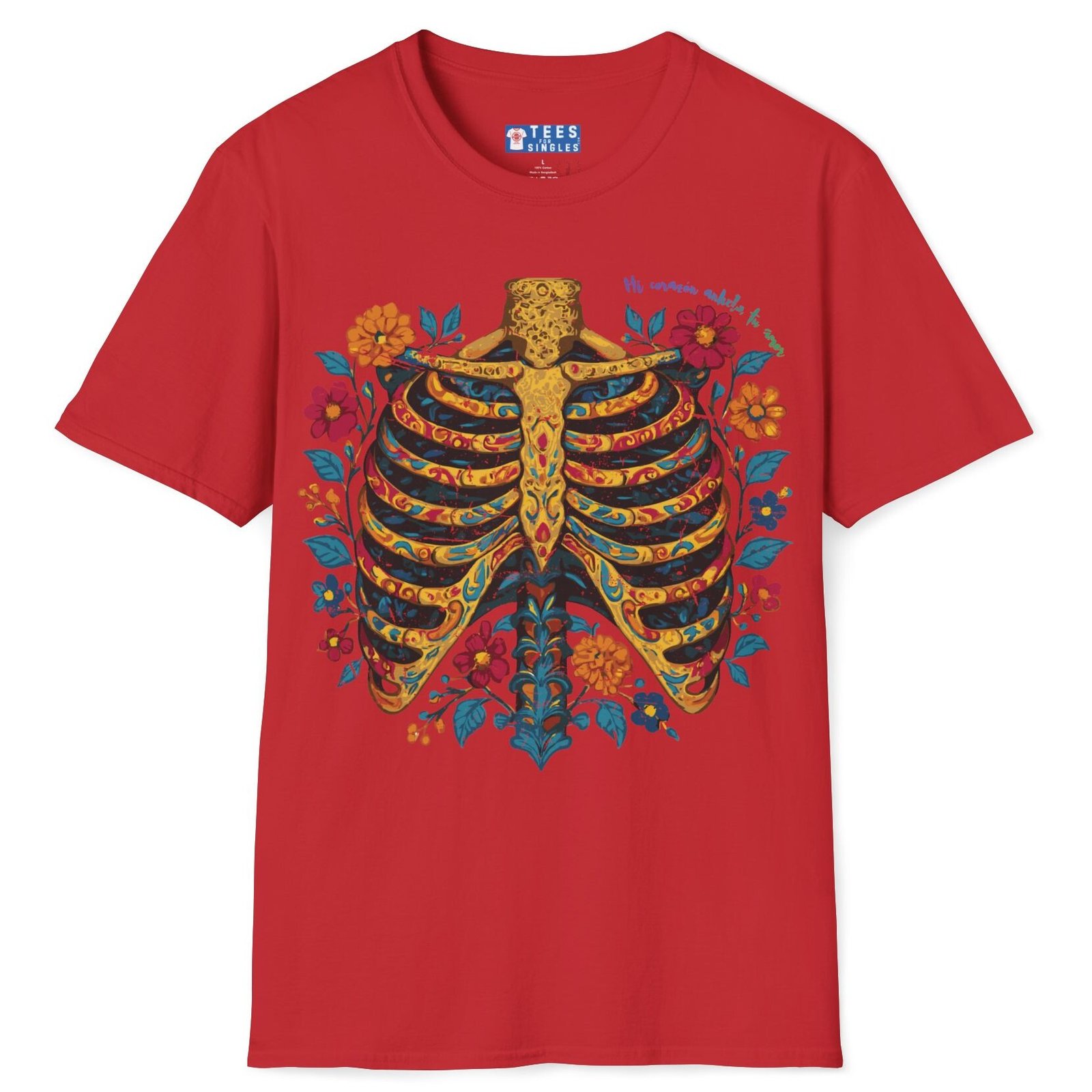 Beautiful, bold, and quietly romantic — the Mi Corazón Premium Tee blends striking art with a hint of heart. The hand-illustrated skeleton ribcage and vibrant floral detailing symbolize love that lives beneath the surface — and on the upper corner, a subtle message in Spanish: “Mi corazón anhela tu amor” — “My heart longs for your love.” ❤️