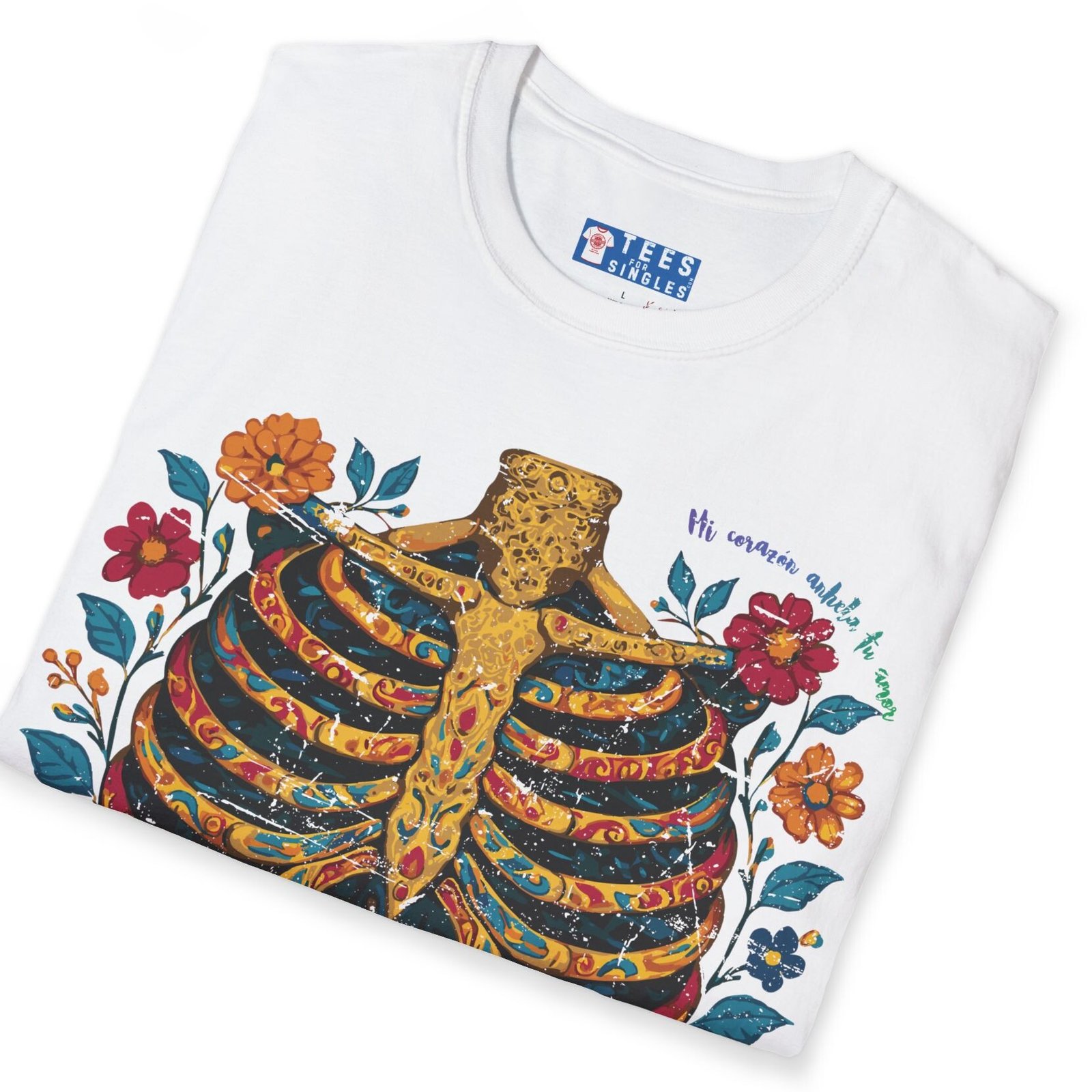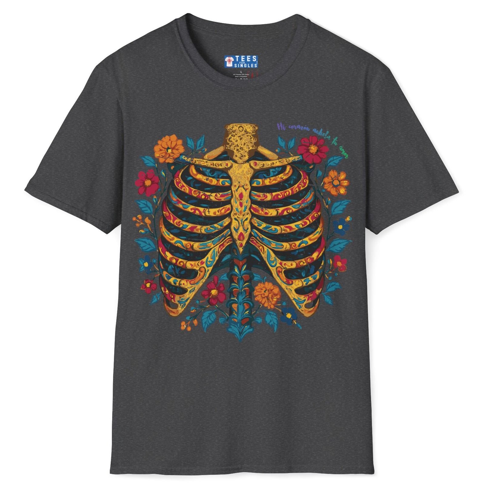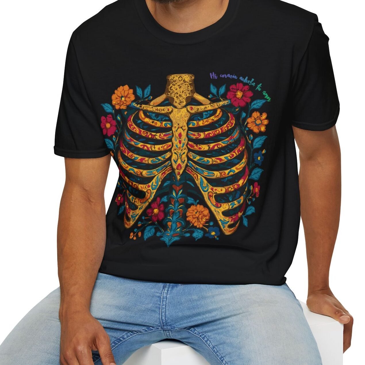 Keywords/Tags: mi corazon shirt, spanish romantic shirt, latin love tee, floral skeleton shirt, dia de los muertos shirt, romantic shirt for men, conversation starter tee, beautiful art shirt, latin culture tee, dating shirt, vox nova clothing