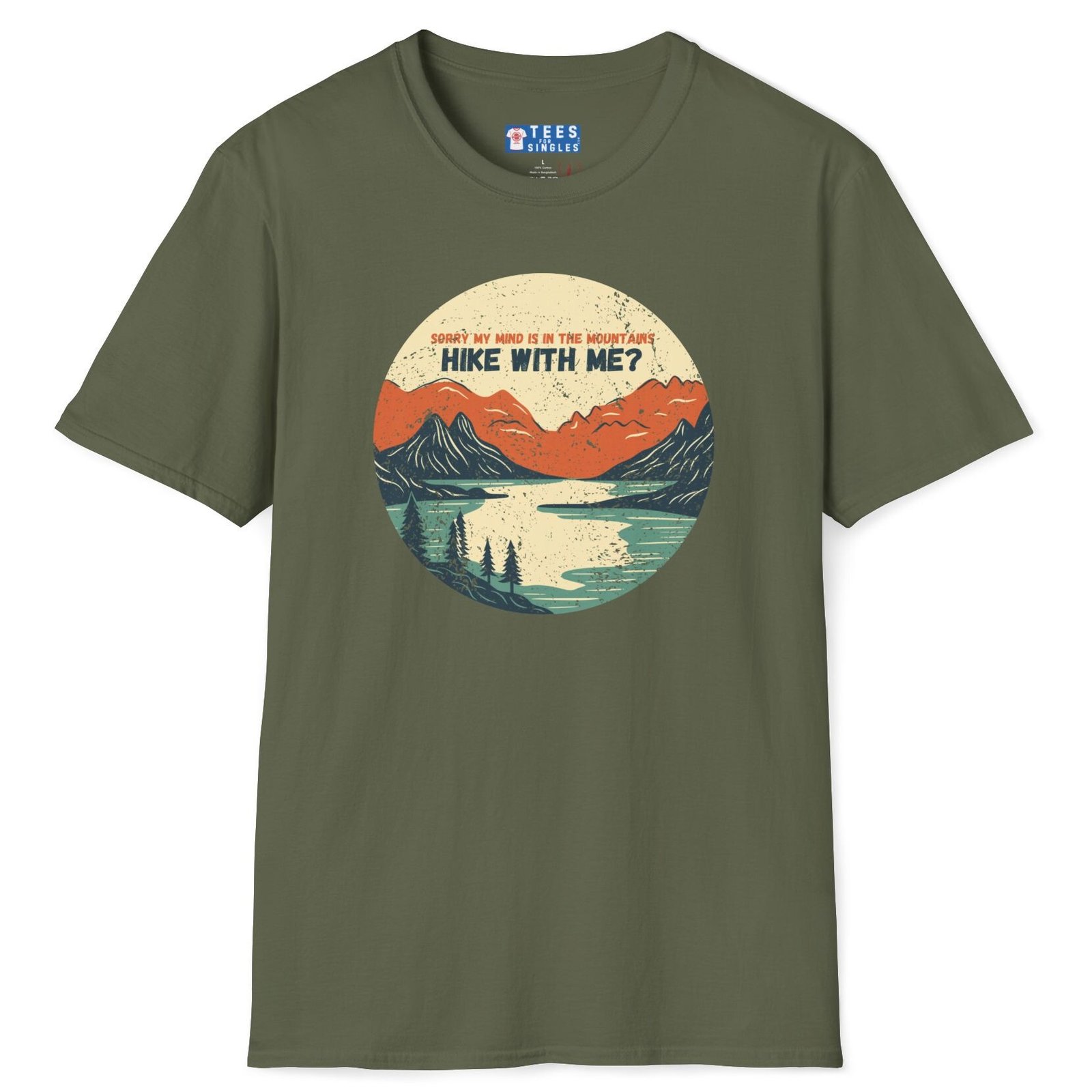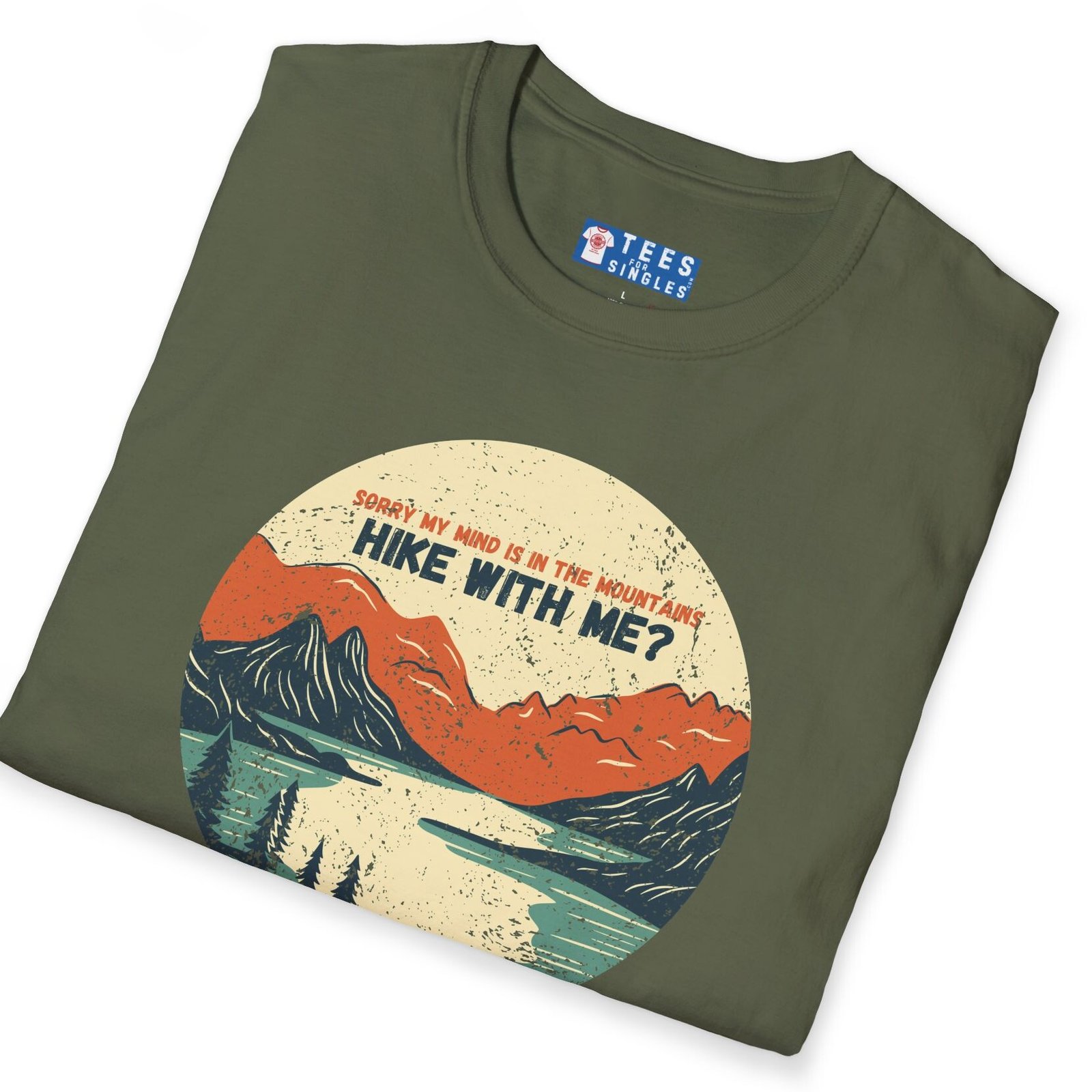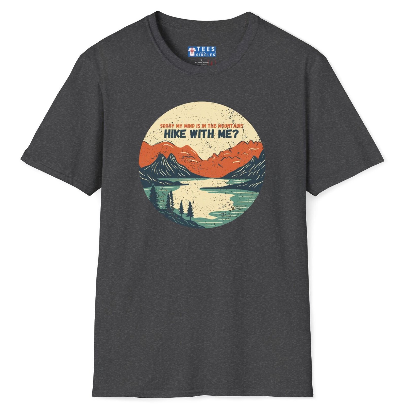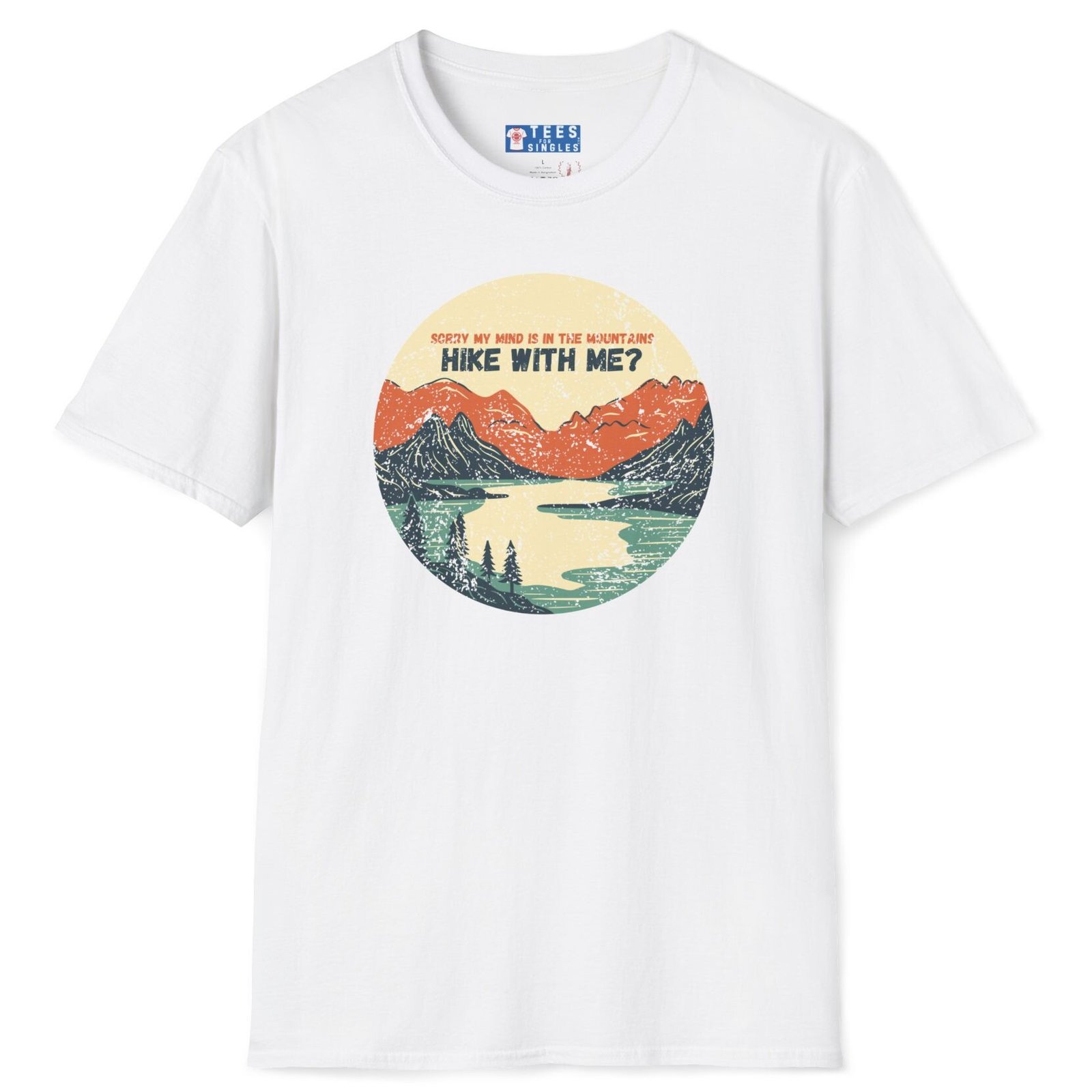 Keywords/Tags: hike with me shirt, mountain dating tee, outdoor singles top, Gildan 64000, retro landscape graphic, Tees for Singles, trail buddy invite, conversation starter, nature lover apparel, post covid connection, adventure partner shirt