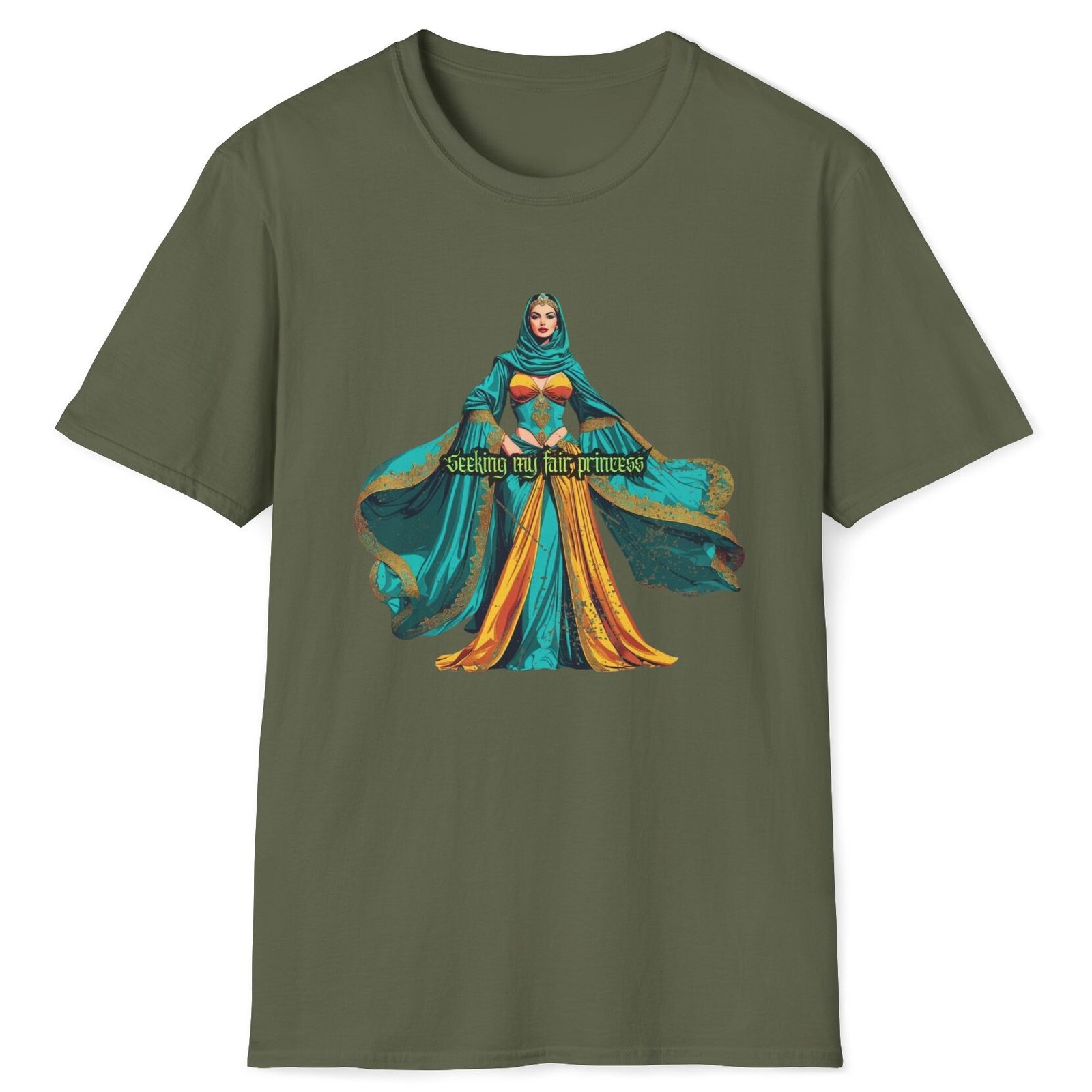 Keywords/Tags: seeking my fair princess shirt, goth romantic tee, hopeless romantic apparel, premium fairy tale shirt, Gildan 6400 softstyle, conversation starter tee, find your princess, medieval fantasy graphic, post-covid connection, vox nova clothing philosophy