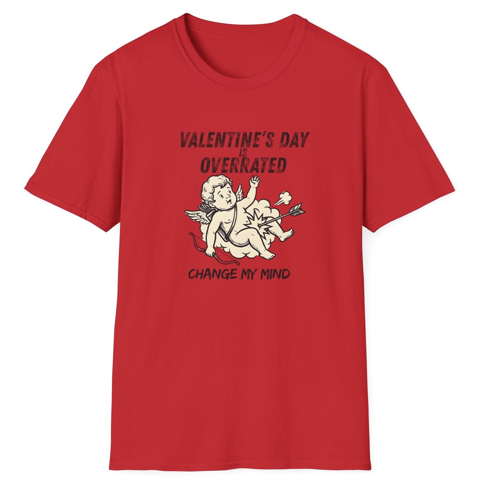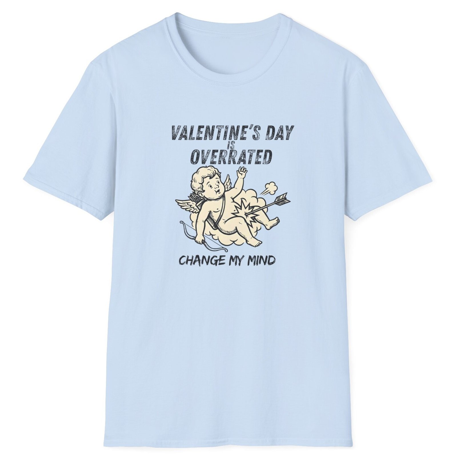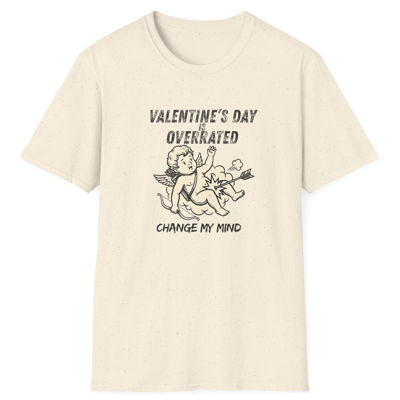 Distressed bold text reads “VALENTINE’S DAY IS OVERRATED” with “CHANGE MY MIND” underneath, paired with a vintage-style cupid/cherub illustration getting hilariously “hit” by an arrow mid-flight. It’s the kind of take that makes women smirk, roll their eyes, or feel forced to comment, which is the whole point.