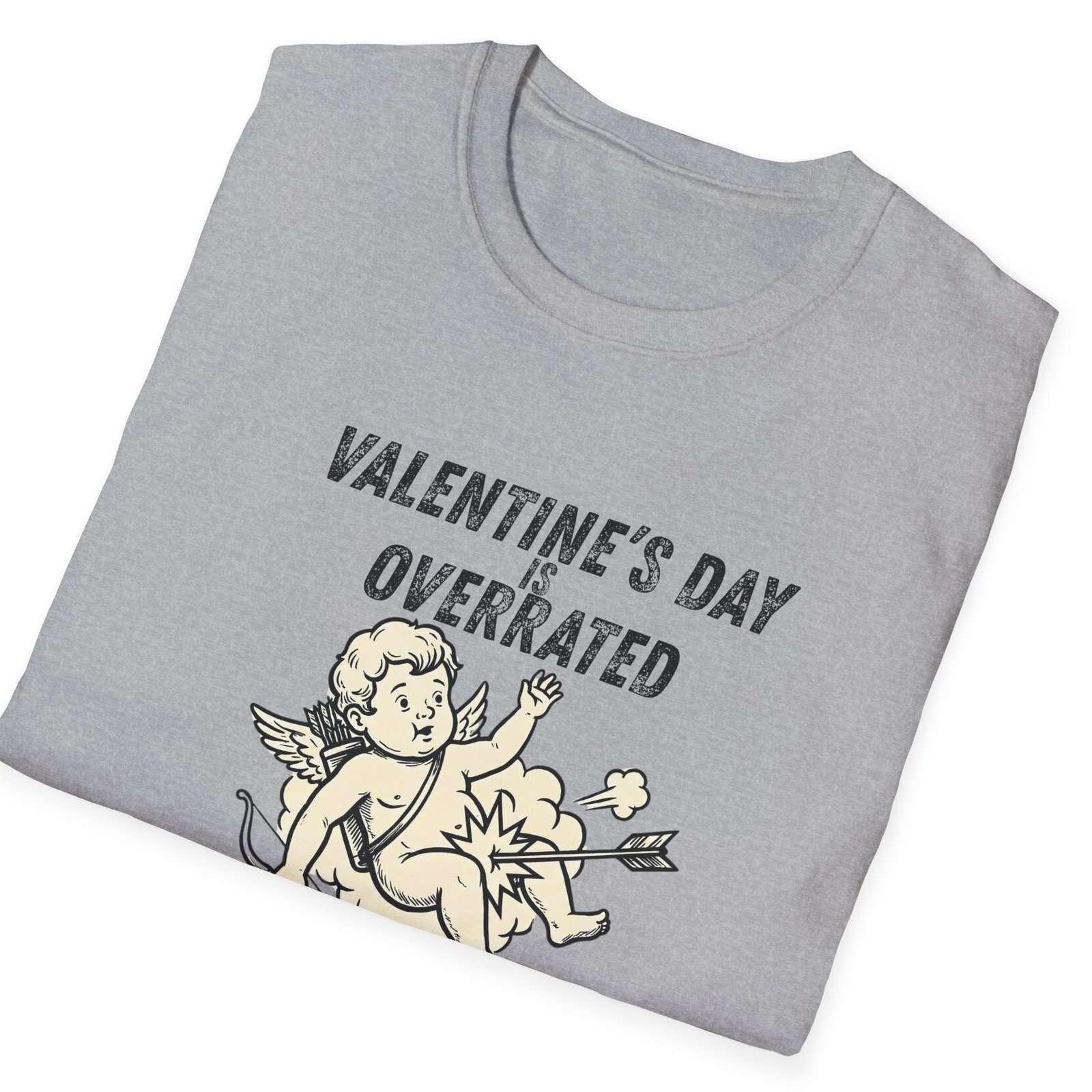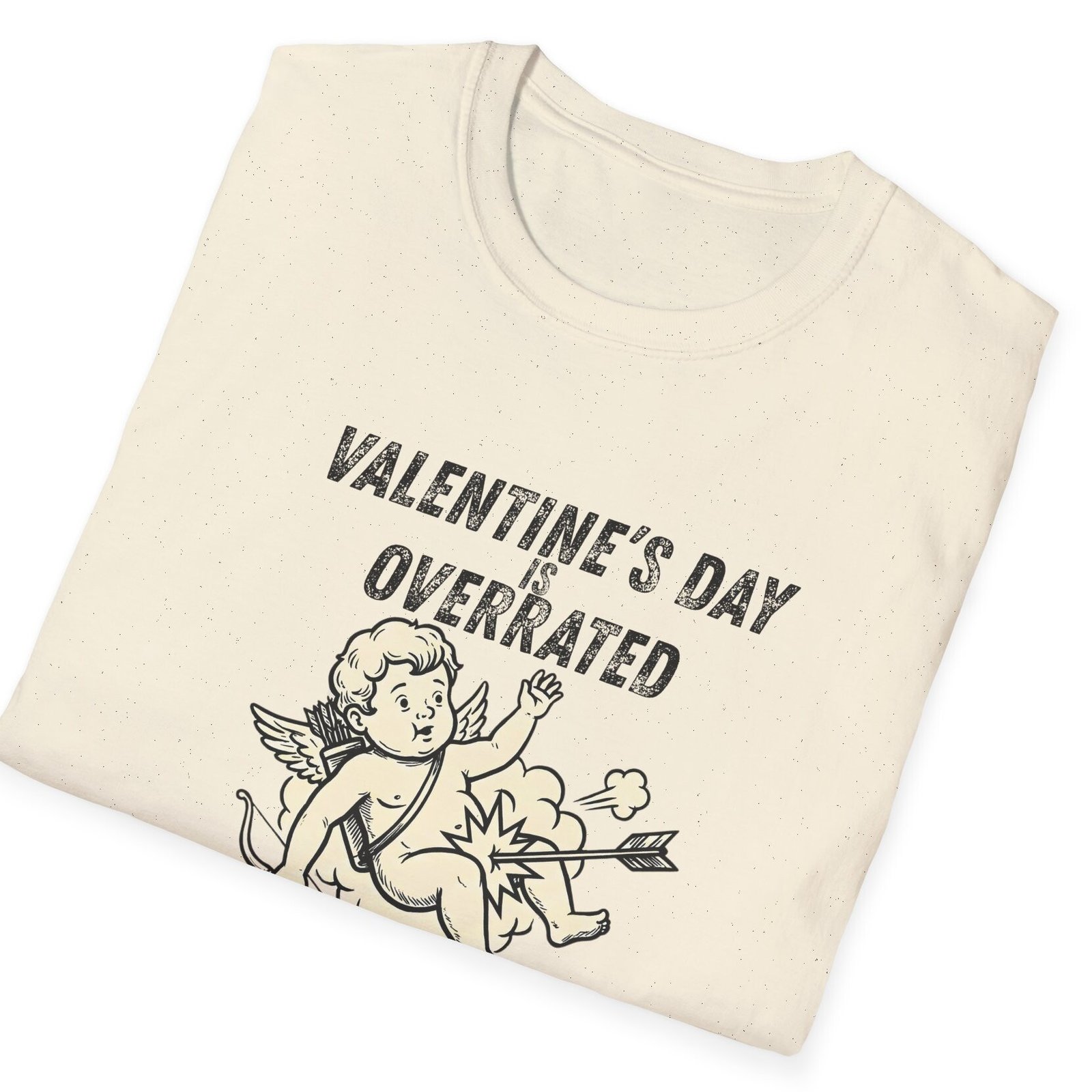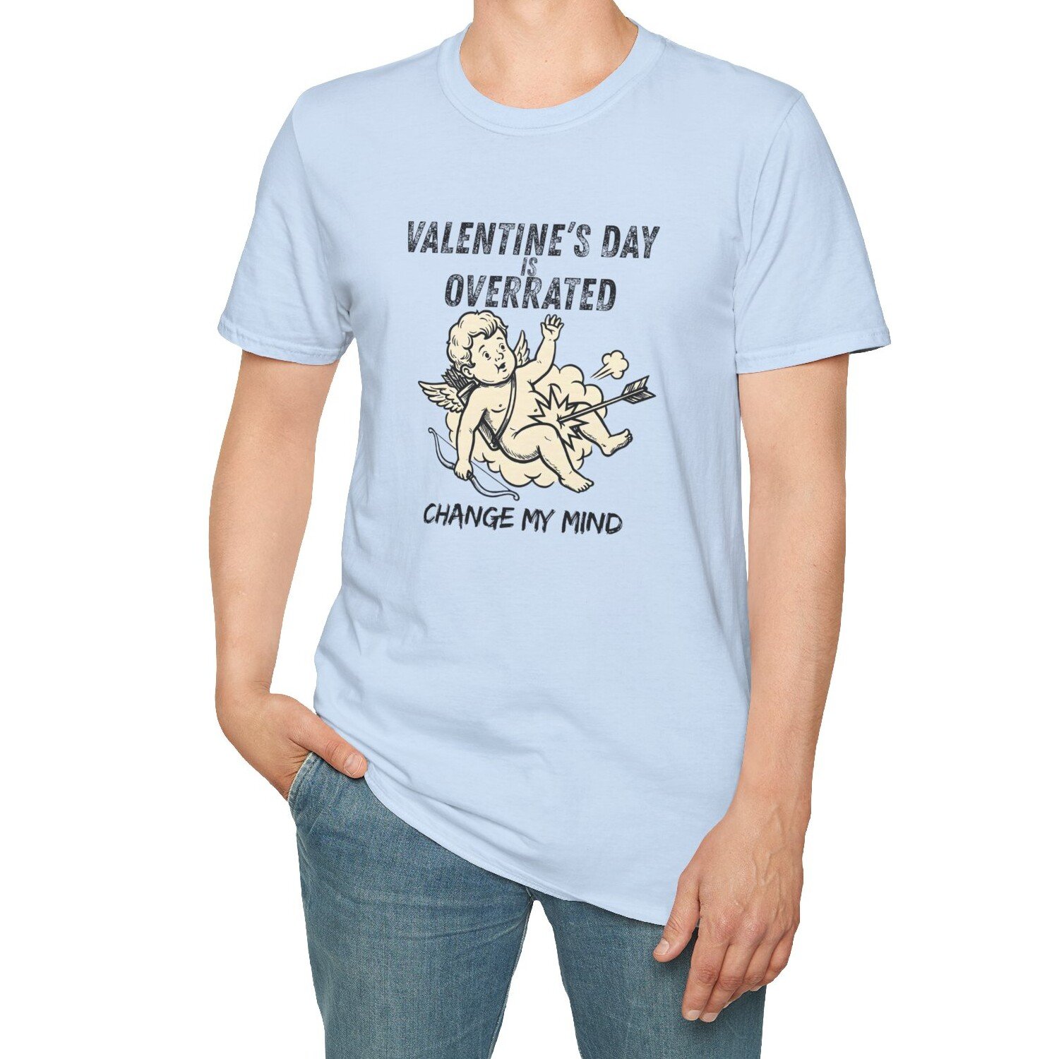 Distressed bold text reads “VALENTINE’S DAY IS OVERRATED” with “CHANGE MY MIND” underneath, paired with a vintage-style cupid/cherub illustration getting hilariously “hit” by an arrow mid-flight. It’s the kind of take that makes women smirk, roll their eyes, or feel forced to comment, which is the whole point.