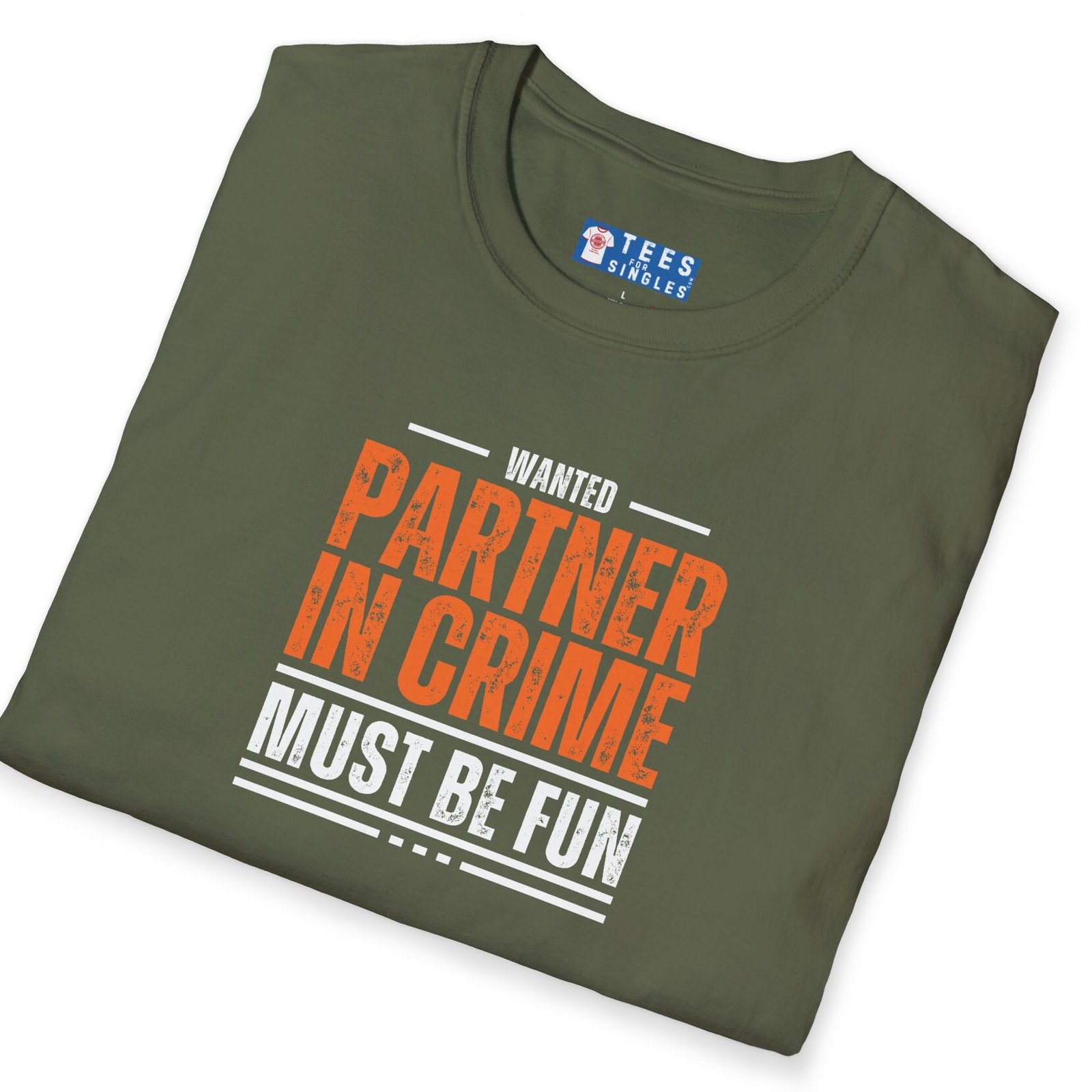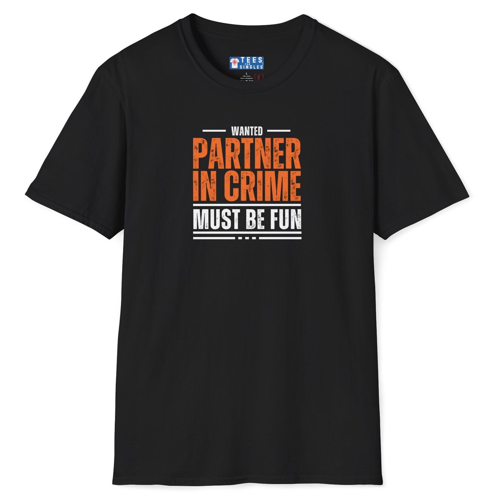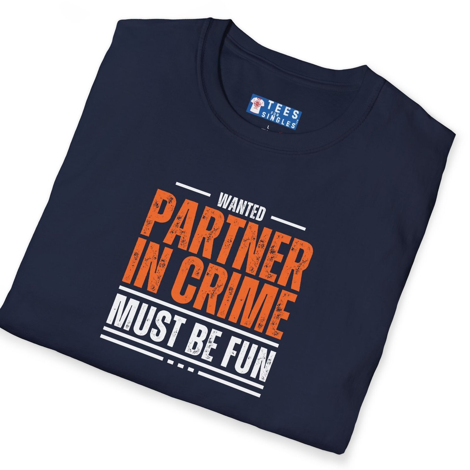 Keywords/Tags: partner in crime shirt, fun singles tee, conversation starter top, Gildan 64000, Tees for Singles, bold statement apparel, flirt shirt, ice breaker t-shirt, meet new people, post covid connection, playful dating wear