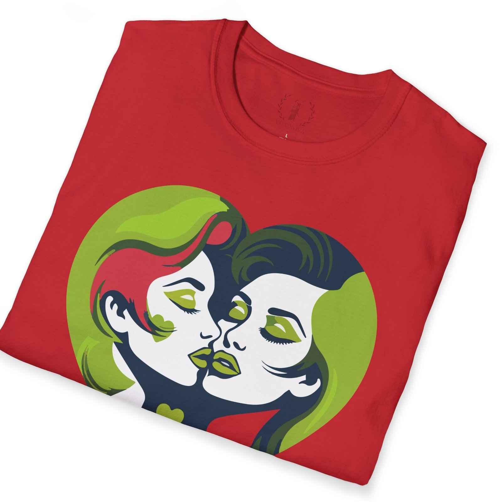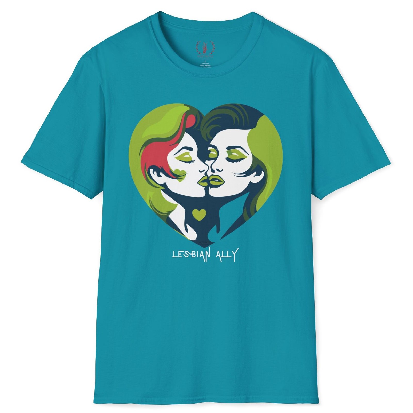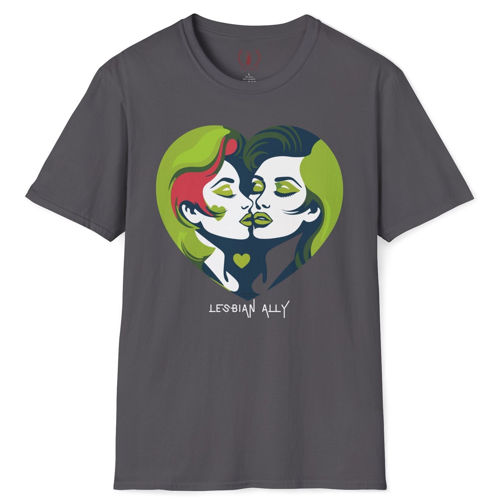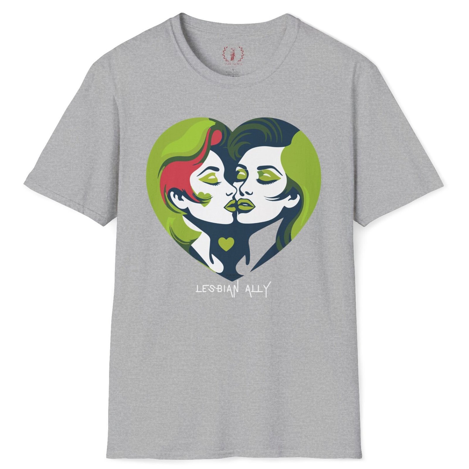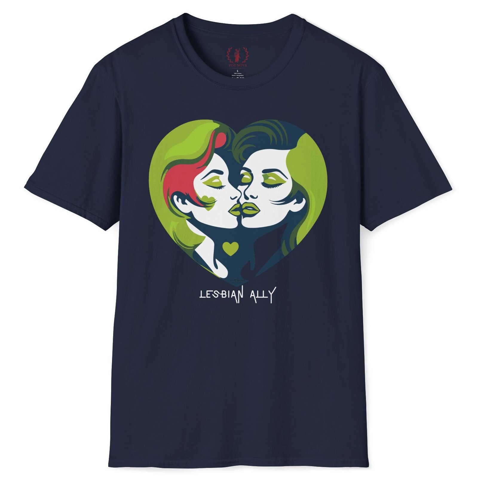 Keywords/Tags: lesbian ally shirt, support LGBTQ shirt, bold pride tee, Gildan 64000, Vox Nova Clothing, stand with lesbians, heart kiss graphic, ally pride tee, LGBTQ+ support apparel, straight ally fashion, find your people shirt, expressive identity wear