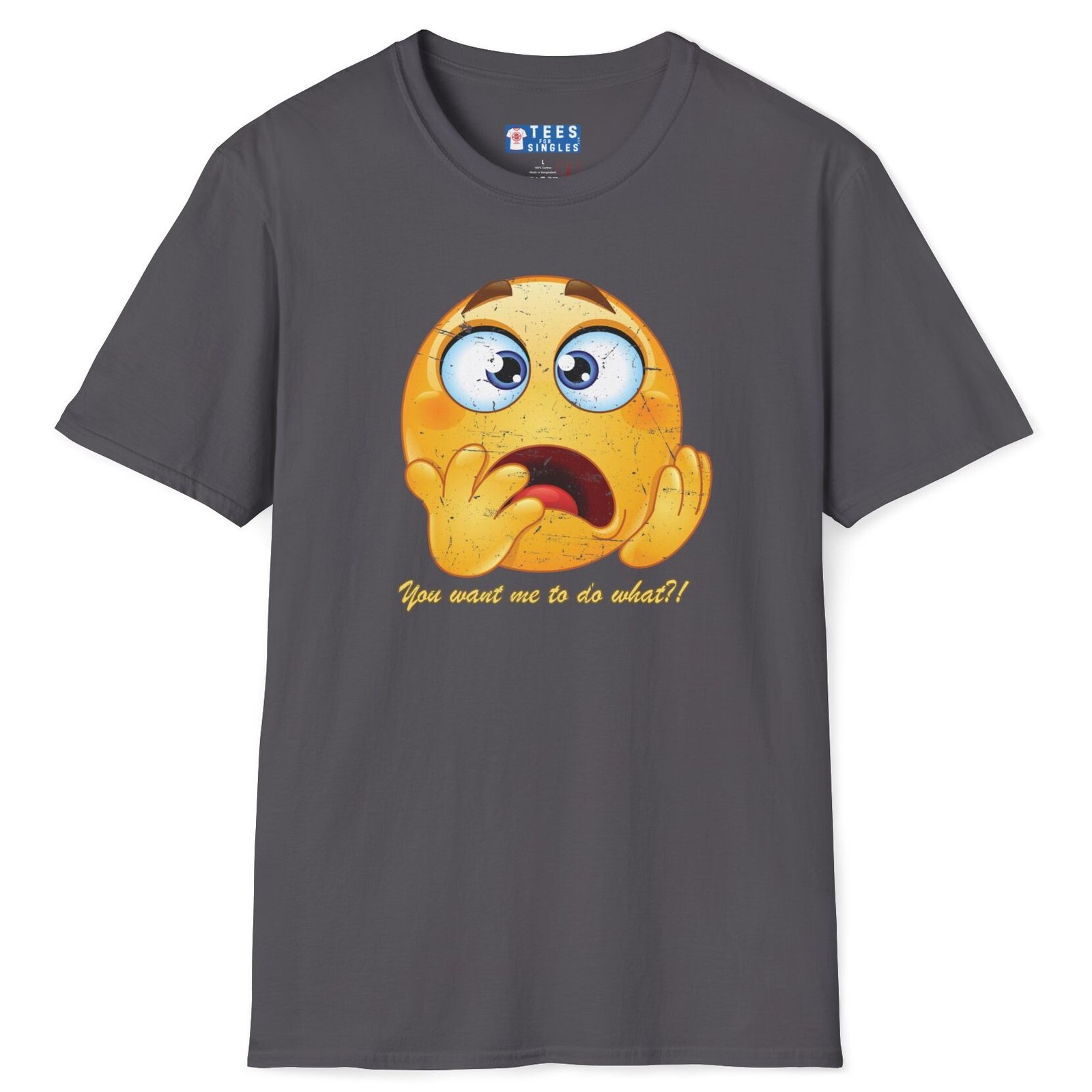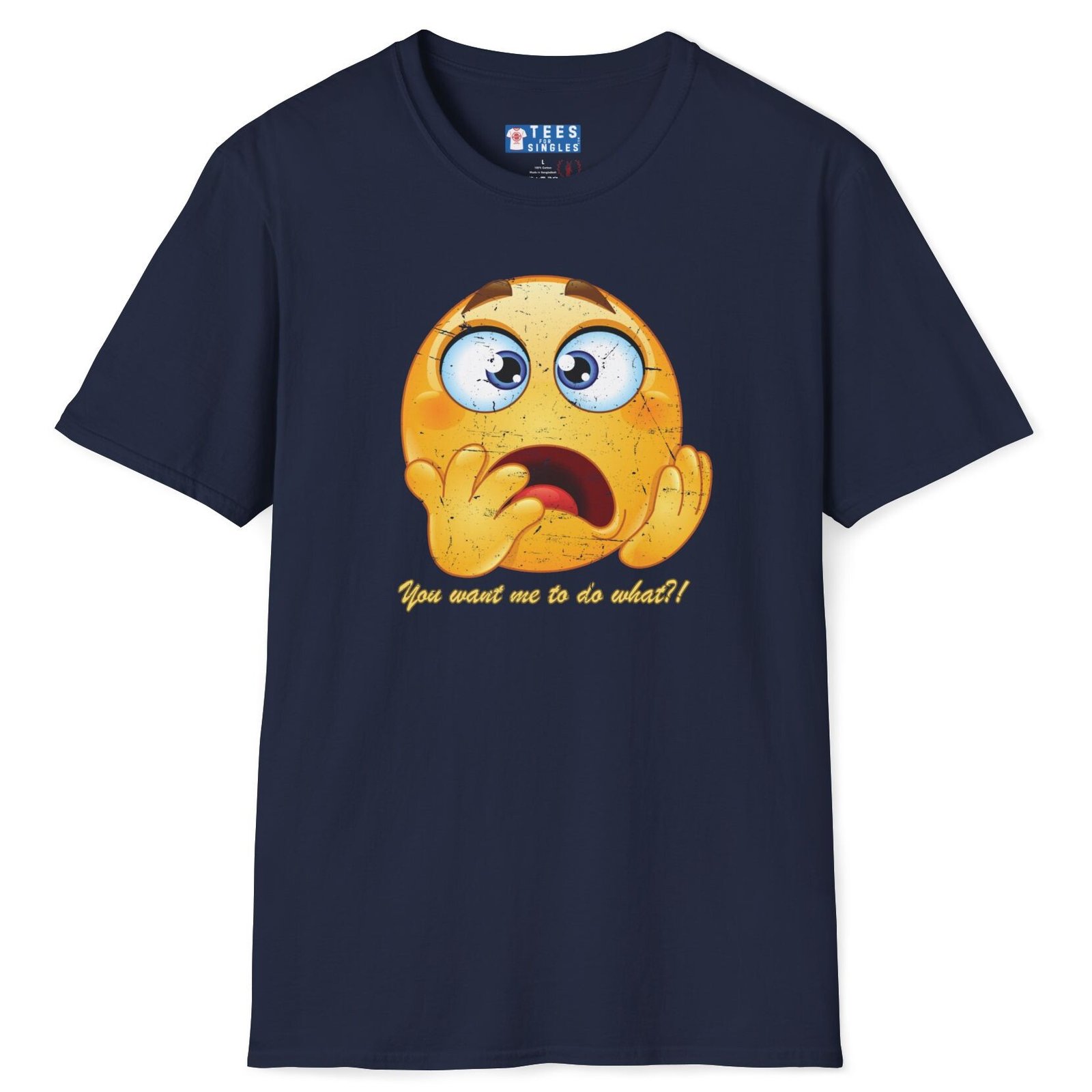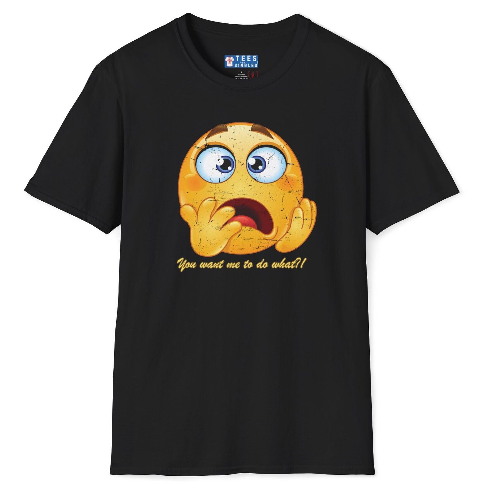 Keywords/Tags: you want me to do what shirt, shocked emoji tee, conversation starter shirt, flirty funny t-shirt, Gildan 64000 premium, Vox Nova Clothing, ice breaker apparel, post covid dating wear, playful statement tee, bold graphic top, find your tribe, spark connection