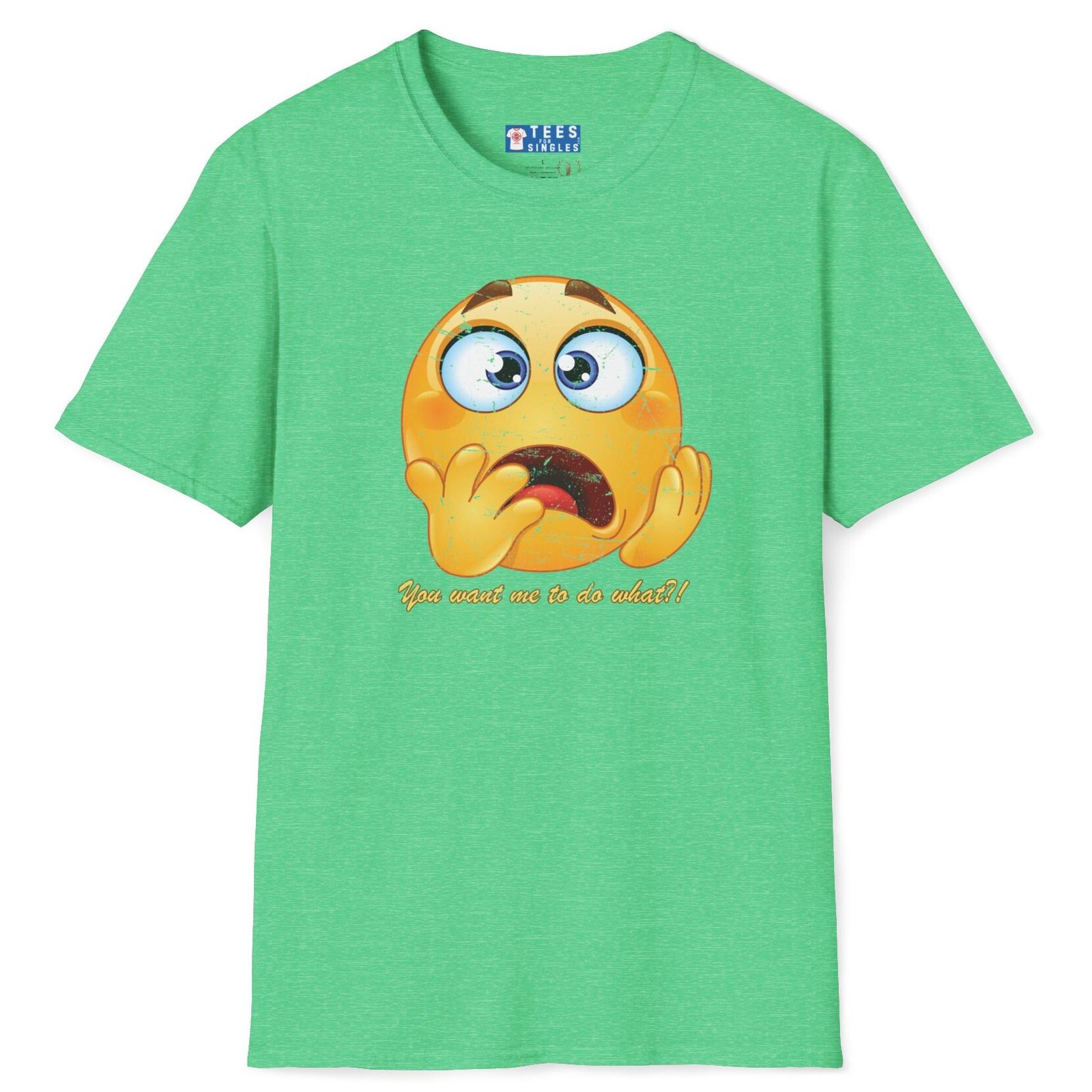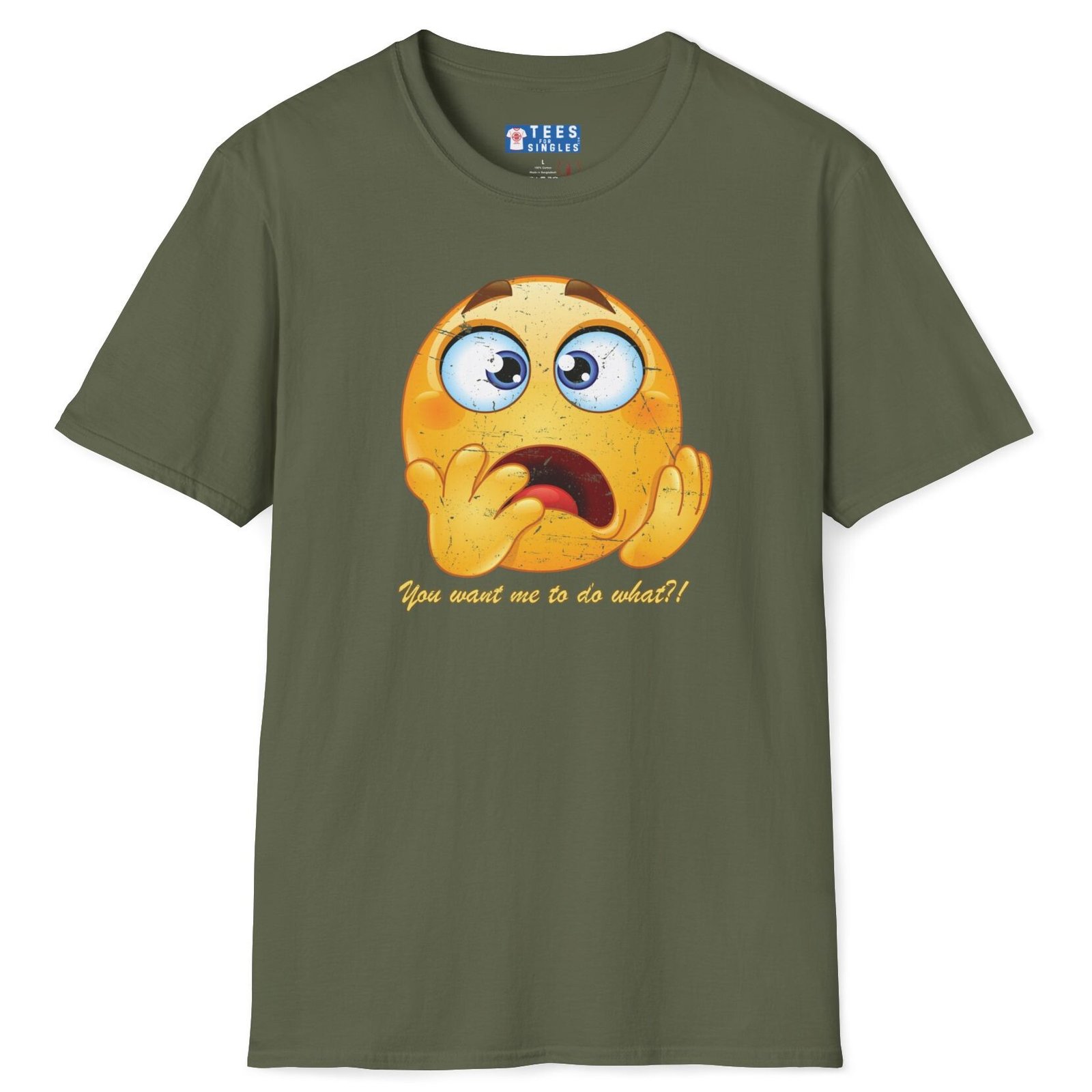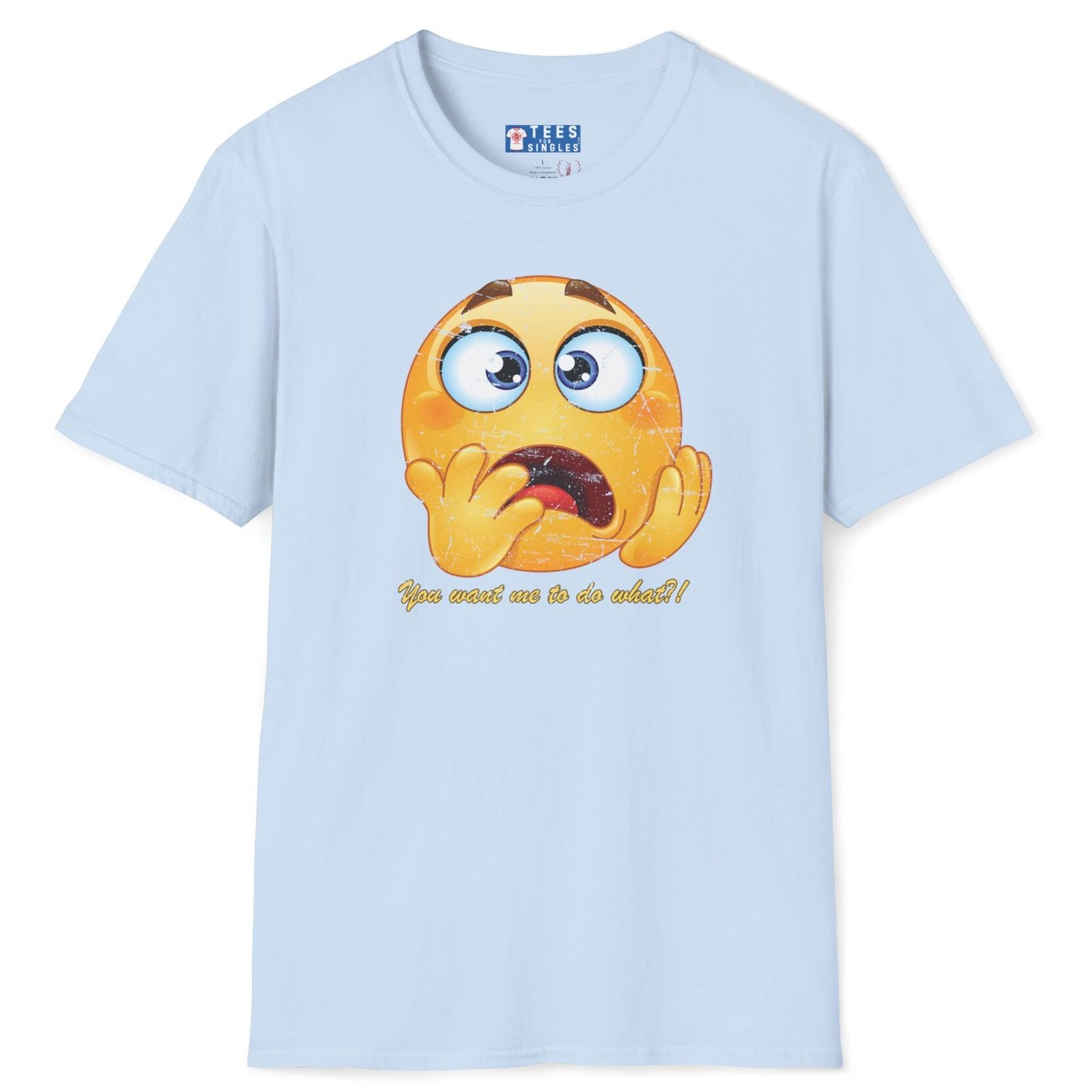 Keywords/Tags: you want me to do what shirt, shocked emoji tee, conversation starter shirt, flirty funny t-shirt, Gildan 64000 premium, Vox Nova Clothing, ice breaker apparel, post covid dating wear, playful statement tee, bold graphic top, find your tribe, spark connection